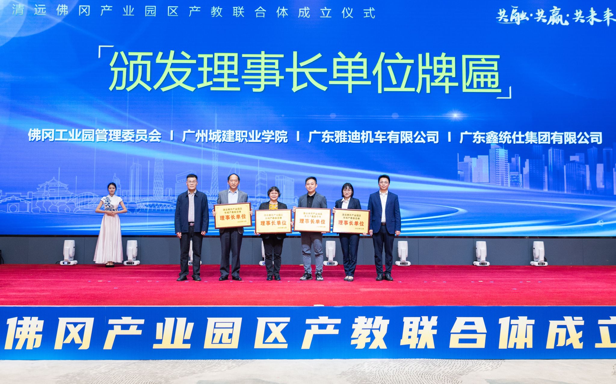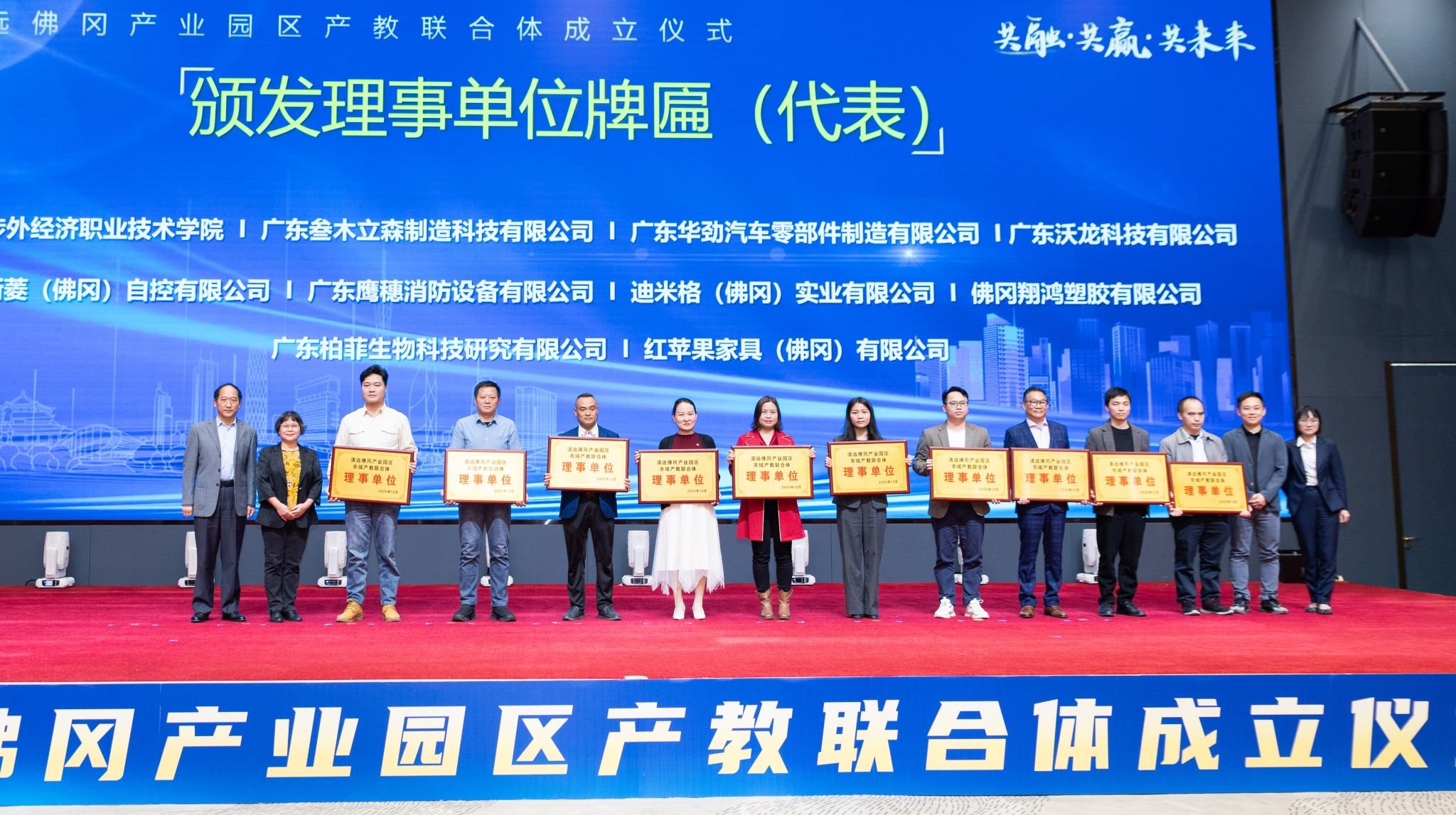 启动仪式后,大会举行了理事长单位与理事单位授牌仪式。佛冈县工业园管委会、广州城建职业学院、广东雅迪机车有限公司、广东鑫统仕集团有限公司作为牵头单位,获授理事长单位牌匾;广州涉外经济职业技术学院、广东叁木立森制造科技有限公司等10余家高校与企业成为首批理事单位。授牌仪式不仅是对各单位在产教融合事业中重要作用的认可,更凝聚了各方携手共进、深化合作的坚定共识。