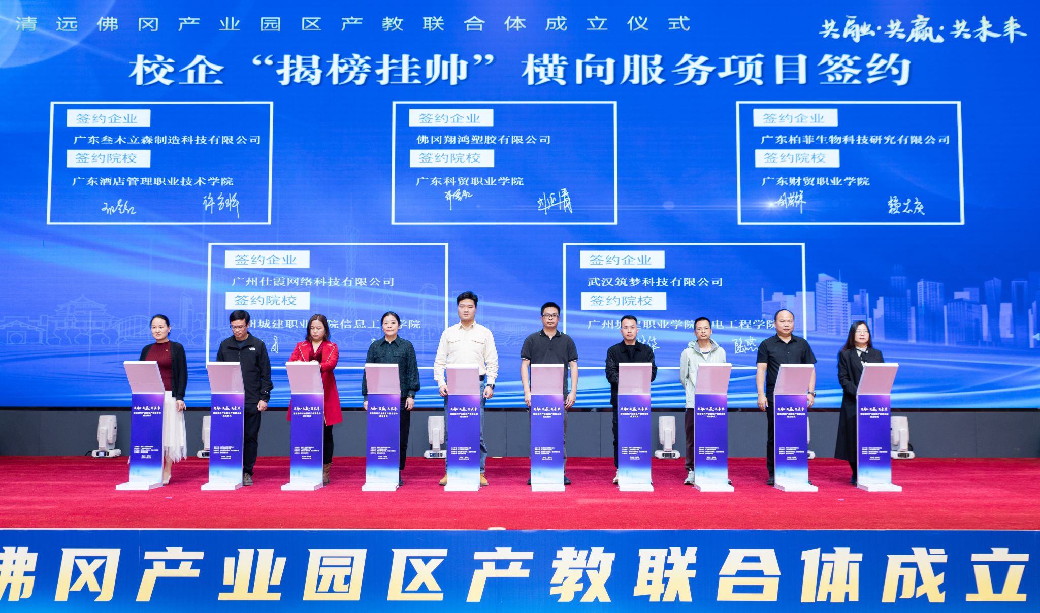 大会核心环节中,佛冈县政府代表陈技常务副县长、清远市教育行政部门代表叶灿强主任督学、佛冈县工业园管委会代表曾洁丽同志、学校代表李国年校长、企业代表侯伟越主管与郭惠平副主管共同上台推动启动杆,正式宣告清远佛冈产业园区产教联合体成立。这一里程碑时刻,标志着佛冈产教融合进入资源整合、协同发力的新阶段,开启了人才共育、产业共兴、区域共荣的新征程。