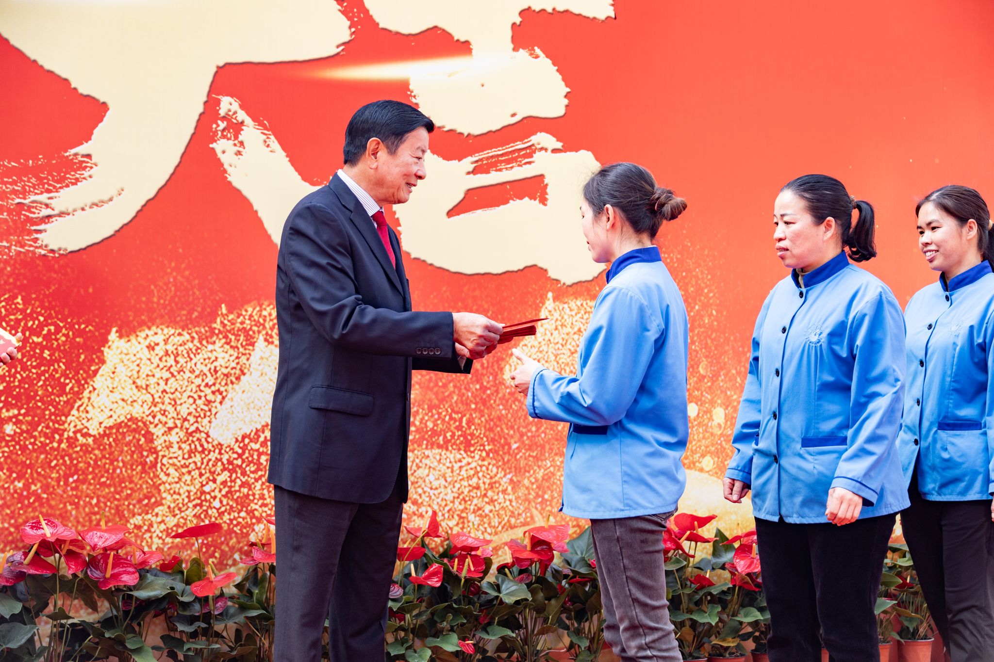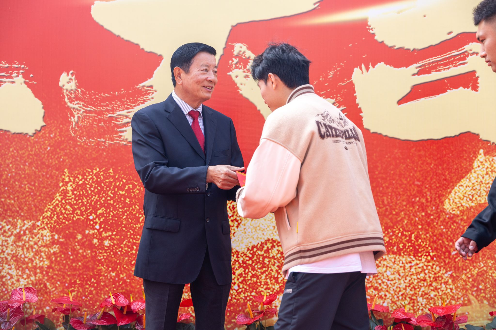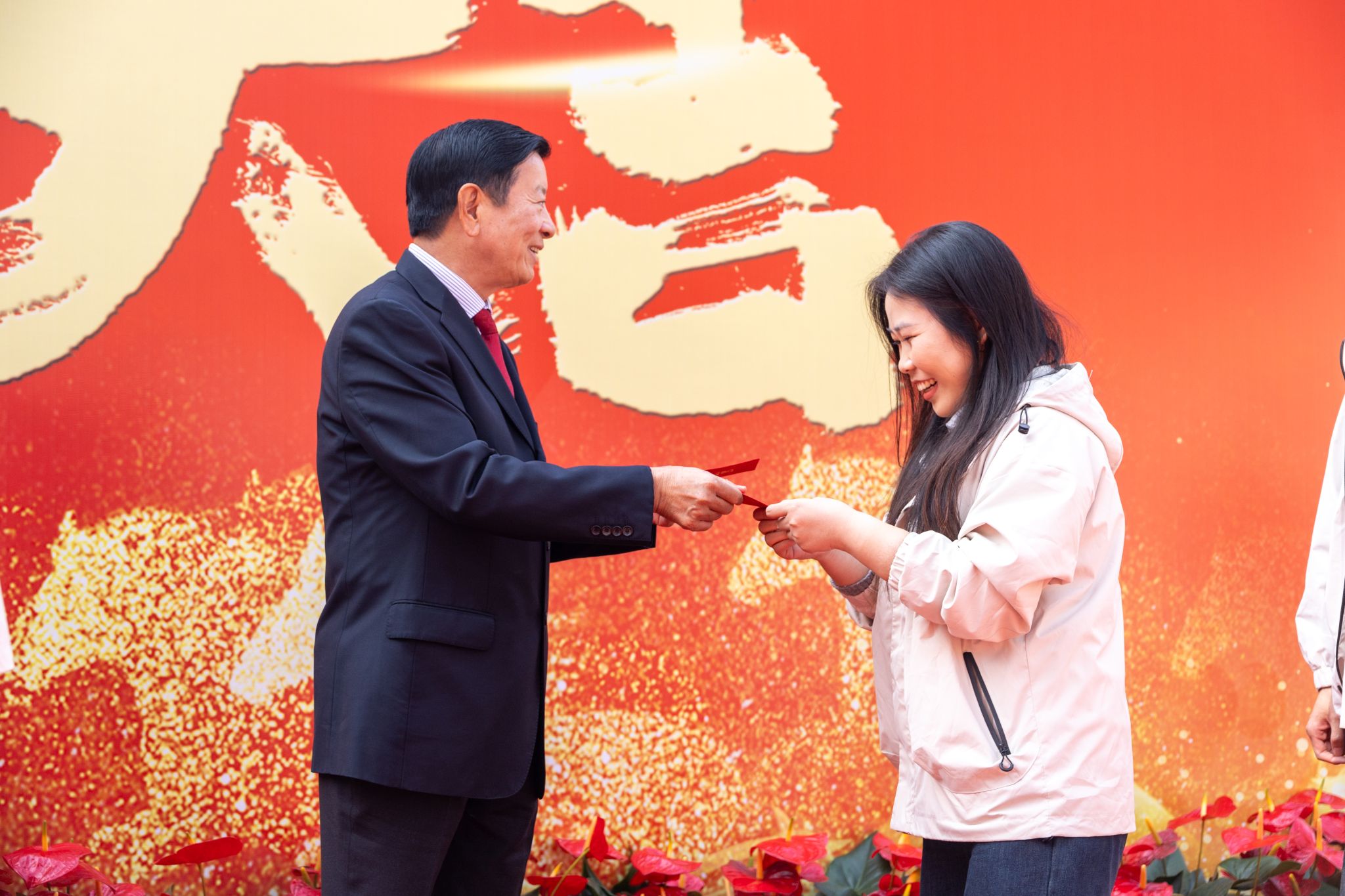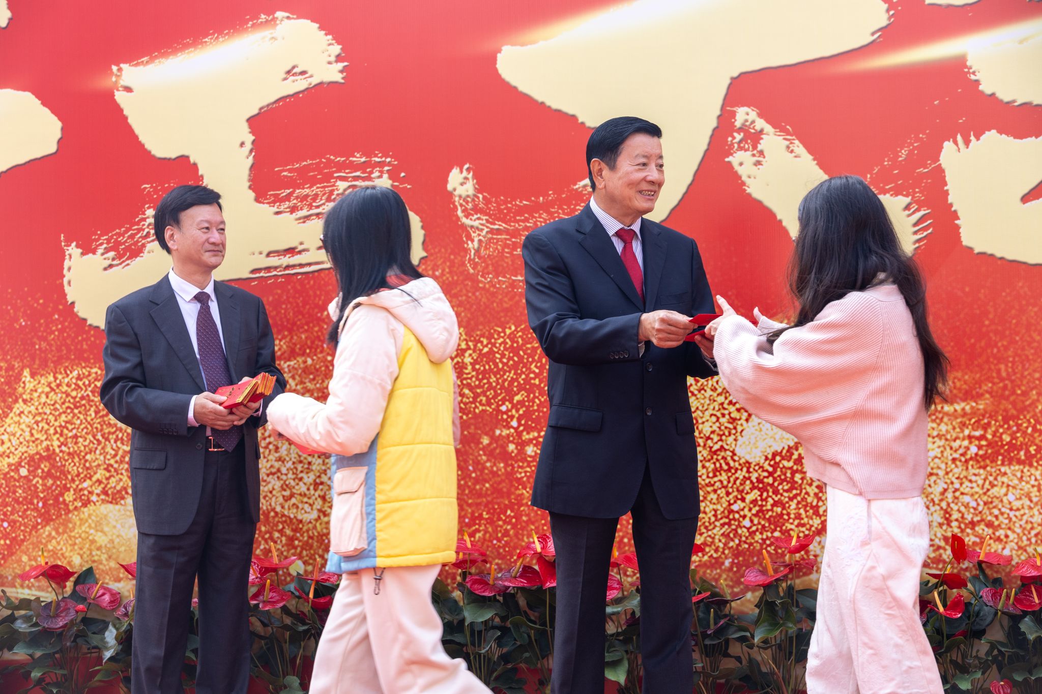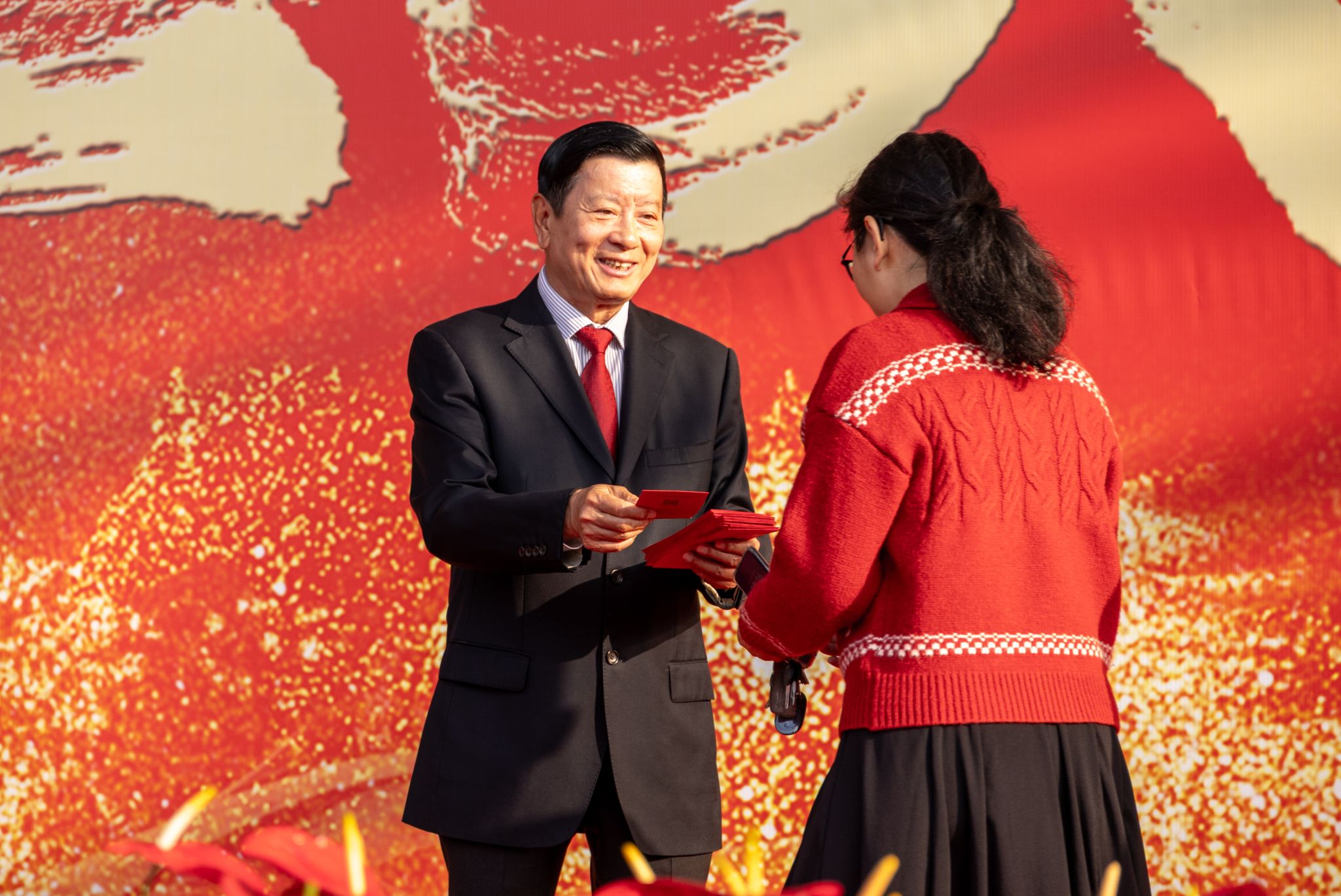 “新年好!”“开工大吉!”“新的一年顺顺利利!”——伴随着一声声真挚的祝福,刘维嘉董事长将红包一一递到教职工手中。每递出一个红包,他都亲切地点头致意,目光中满是关切与期许。