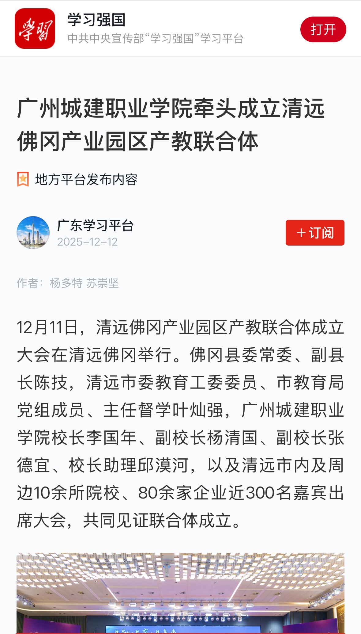 12月11日,清远佛冈产业园区产教联合体成立大会在清远佛冈举行。佛冈县委常委、副县长陈技,清远市委教育工委委员、市教育局党组成员、主任督学叶灿强,广州城建职业学院校长李国年、副校长杨清国、副校长张德宜、校长助理邱漠河,以及清远市内及周边10余所院校、80余家企业近300名嘉宾出席大会,共同见证联合体成立。