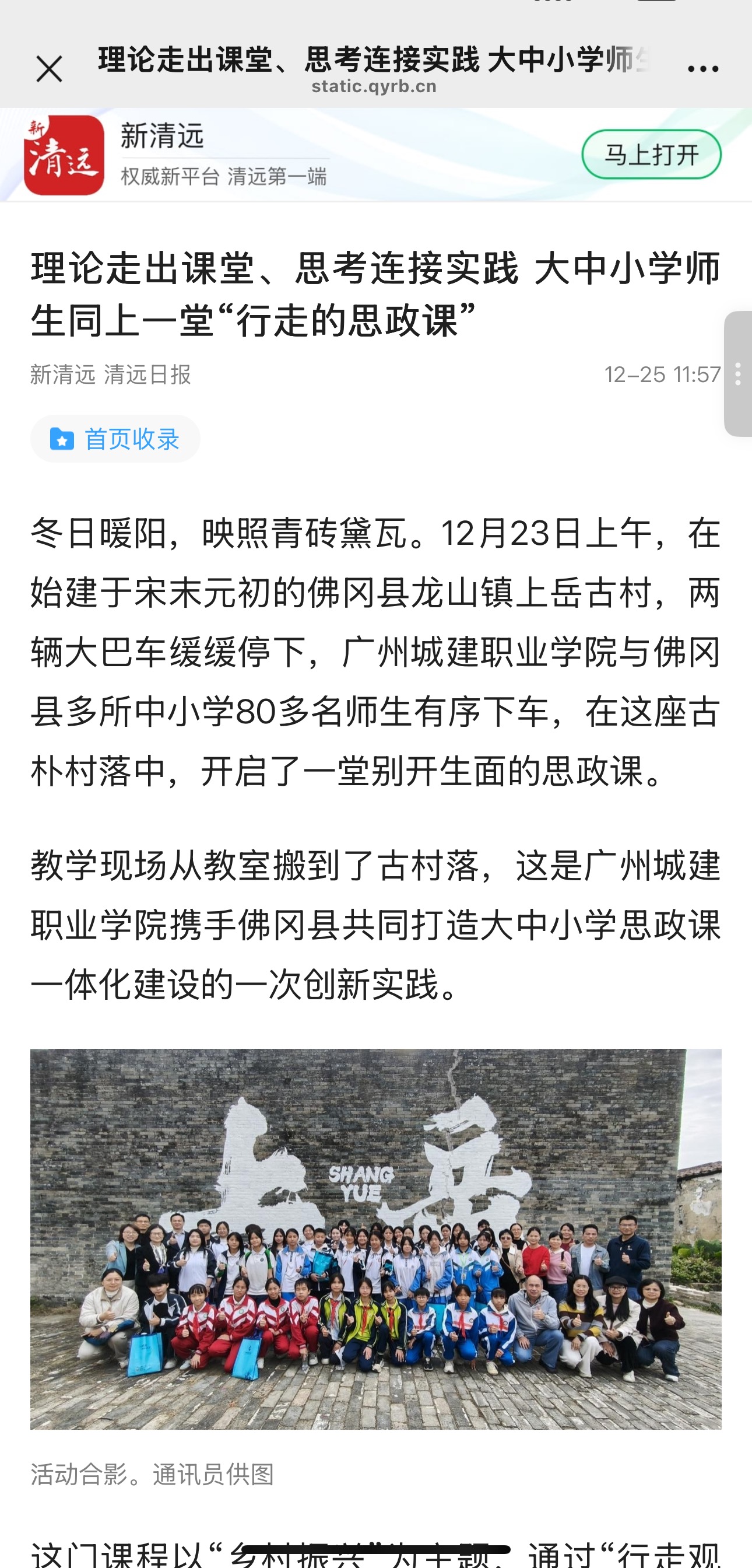 冬日暖阳,映照青砖黛瓦。12月23日上午,在始建于宋末元初的佛冈县龙山镇上岳古村,两辆大巴车缓缓停下,广州城建职业学院与佛冈县多所中小学80多名师生有序下车,在这座古朴村落中,开启了一堂别开生面的思政课。