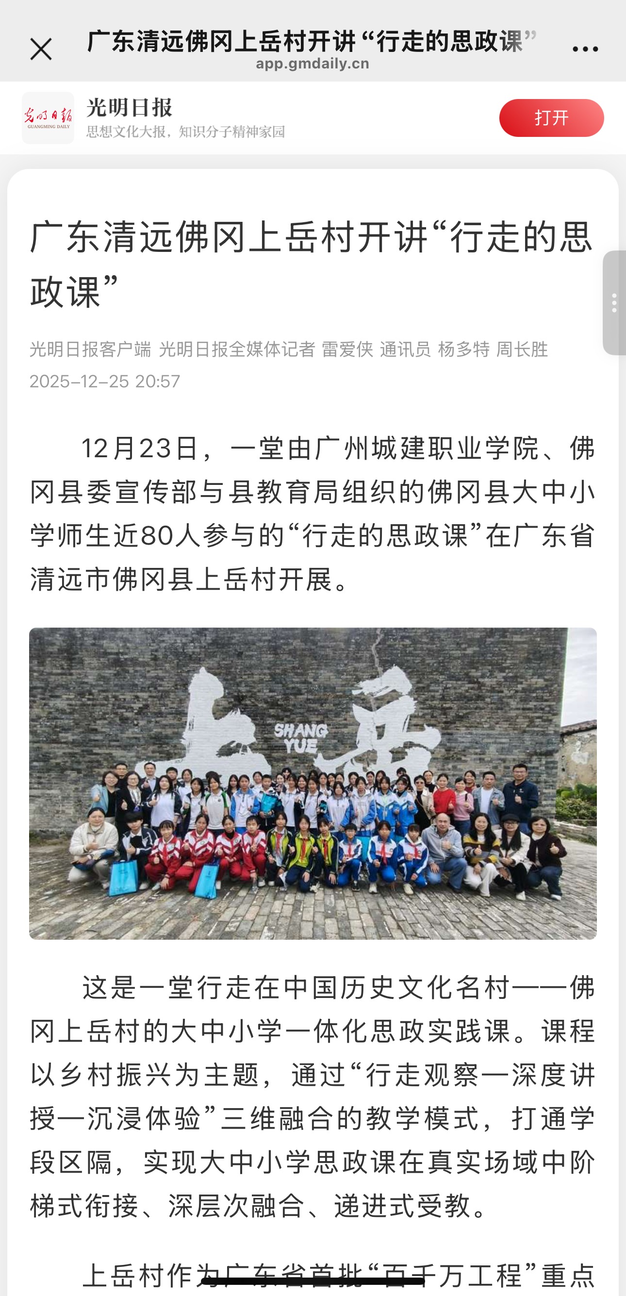 12月23日,一堂由广州城建职业学院、佛冈县委宣传部与县教育局组织的佛冈县大中小学师生近80人参与的“行走的思政课”在广东省清远市佛冈县上岳村开展。