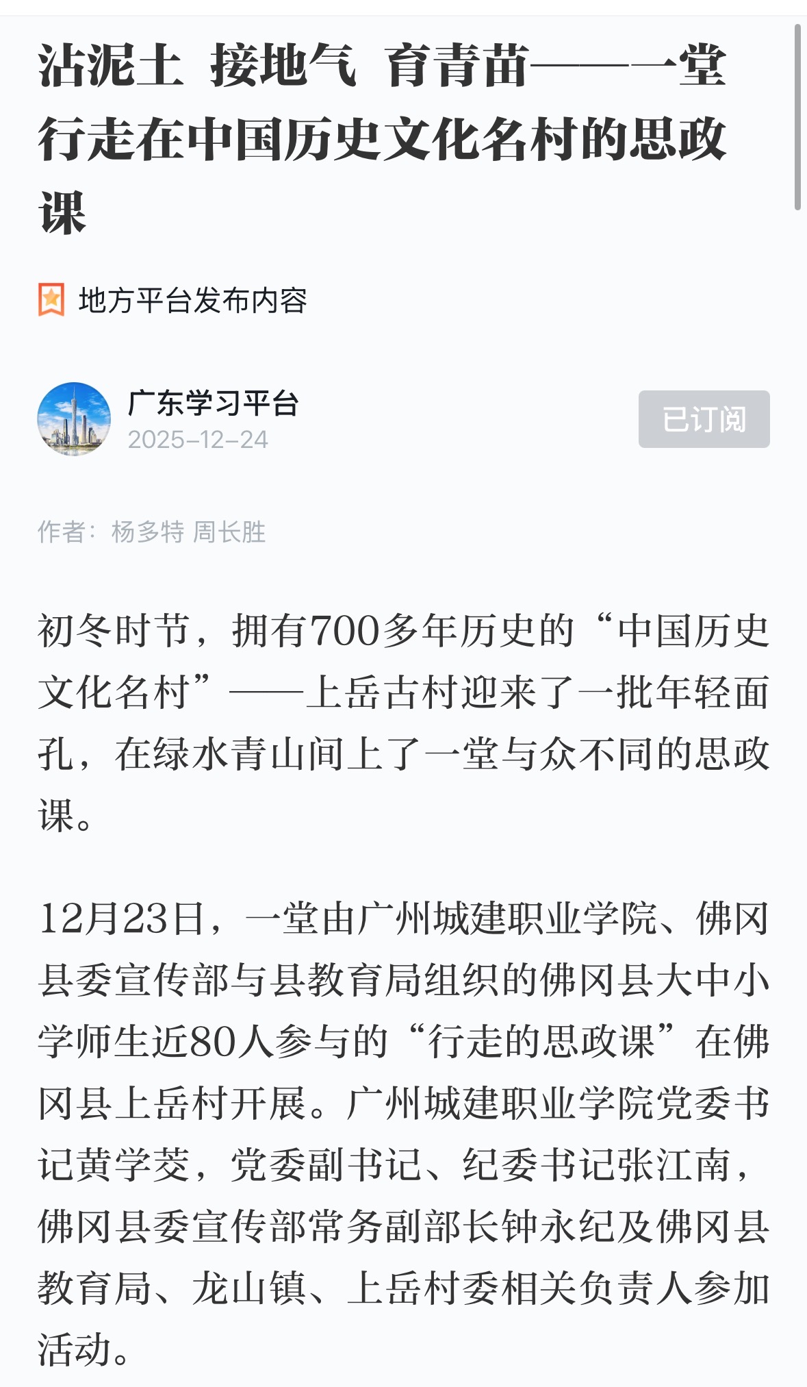 12月23日,一堂由广州城建职业学院、佛冈县委宣传部与县教育局组织的佛冈县大中小学师生近80人参与的“行走的思政课”在佛冈县上岳村开展。广州城建职业学院党委书记黄学茭,党委副书记、纪委书记张江南,佛冈县委宣传部常务副部长钟永纪及佛冈县教育局、龙山镇、上岳村委相关负责人参加活动。