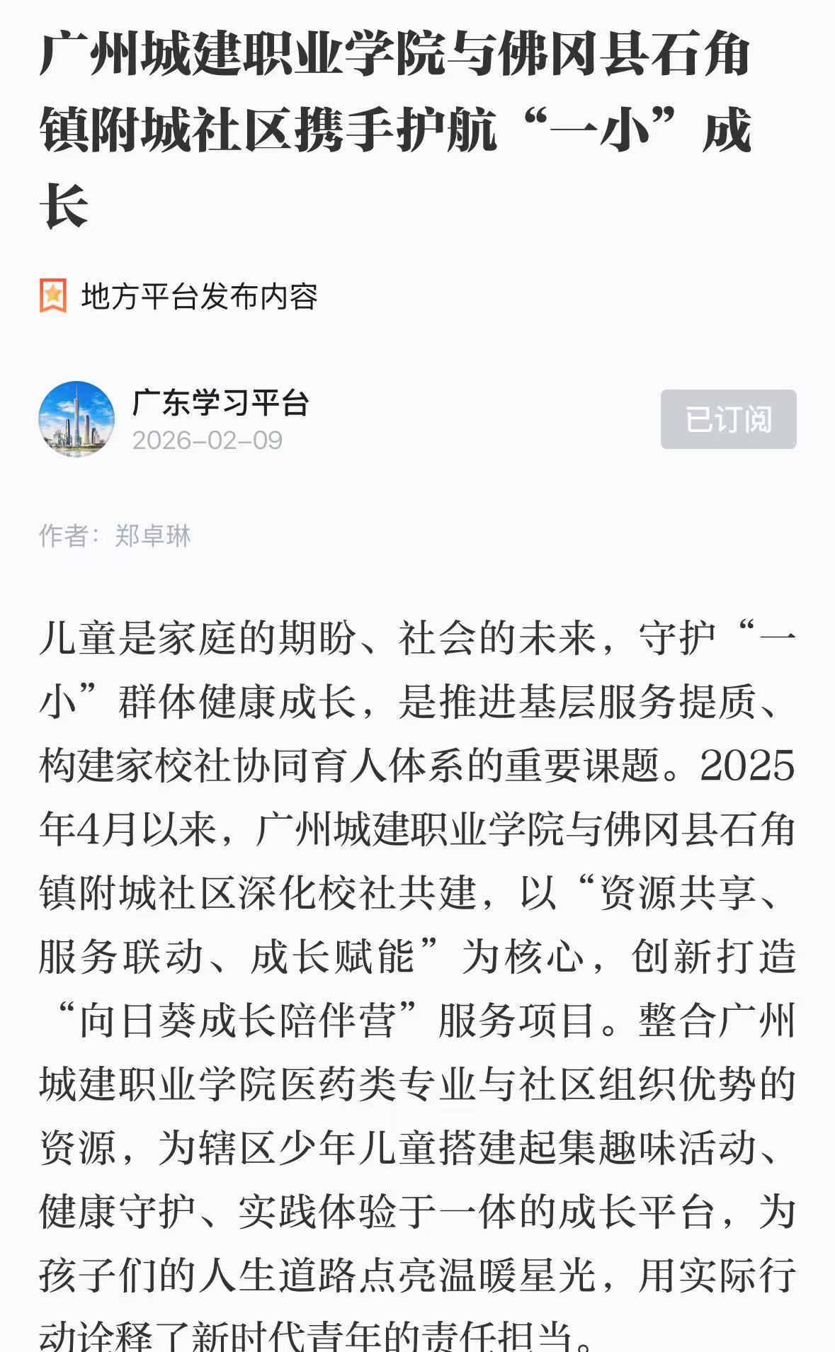 儿童是家庭的期盼、社会的未来,守护“一小”群体健康成长,是推进基层服务提质、构建家校社协同育人体系的重要课题。2025年4月以来,广州城建职业学院与佛冈县石角镇附城社区深化校社共建,以“资源共享、服务联动、成长赋能”为核心,创新打造“向日葵成长陪伴营”服务项目。整合广州城建职业学院医药类专业与社区组织优势的资源,为辖区少年儿童搭建起集趣味活动、健康守护、实践体验于一体的成长平台,为孩子们的人生道路点亮温暖星光,用实际行动诠释了新时代青年的责任担当。