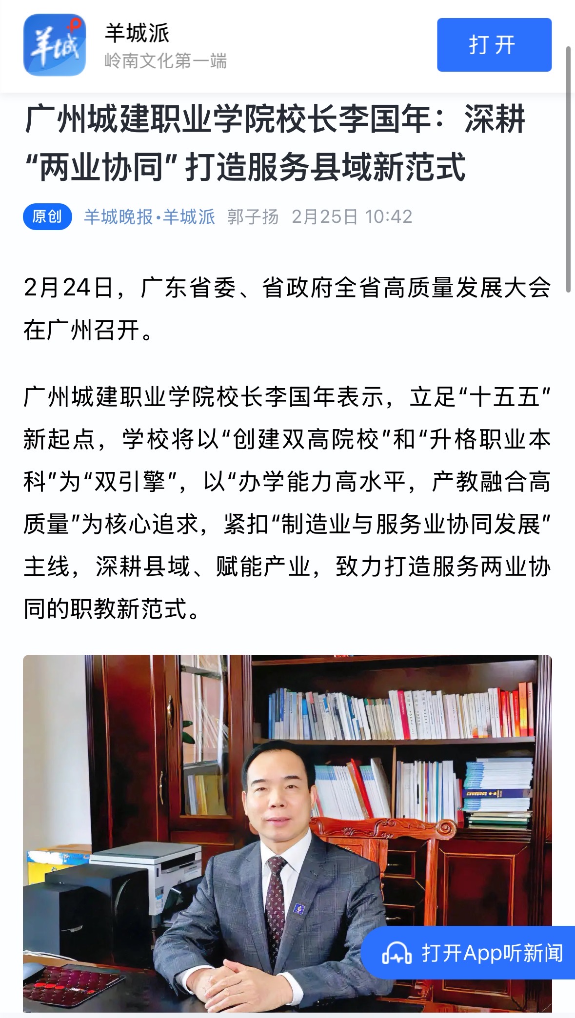 职业教育是离产业最近的教育。广州城建职业学院将锚定高质量发展,在扎根县域、服务产业中走深走实,为广东在推进中国式现代化建设中走在前列贡献“城建力量”。
