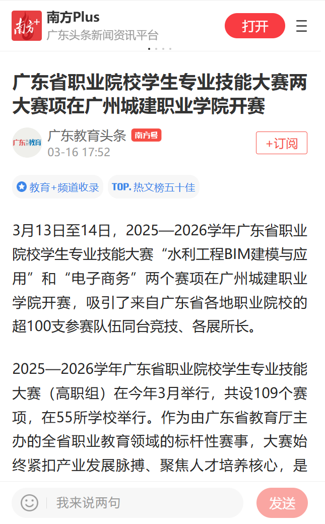 3月13日至14日,2025—2026学年广东省职业院校学生专业技能大赛“水利工程BIM建模与应用”和“电子商务”两个赛项在广州城建职业学院开赛,吸引了来自广东省各地职业院校的超100支参赛队伍同台竞技、各展所长。