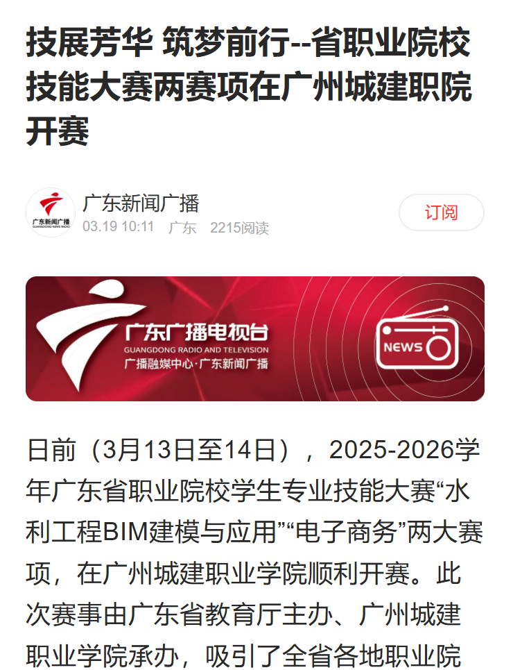 日前(3月13日至14日),2025-2026学年广东省职业院校学生专业技能大赛“水利工程BIM建模与应用”“电子商务”两大赛项,在广州城建职业学院顺利开赛。此次赛事由广东省教育厅主办、广州城建职业学院承办,吸引了全省各地职业院校100多支参赛队伍同台竞技,学子们以技为媒、各展所长,在实操与创新的比拼中,展现新时代职业院校学生的专业素养与青春风采,为广东省“制造业与服务业协同发展”遴选培育优秀高技能人才。