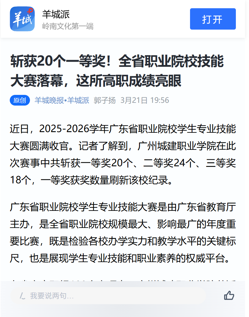 近日,2025-2026学年广东省职业院校学生专业技能大赛圆满收官。记者了解到,广州城建职业学院在此次赛事中共斩获一等奖20个、二等奖24个、三等奖18个,一等奖获奖数量刷新该校纪录。