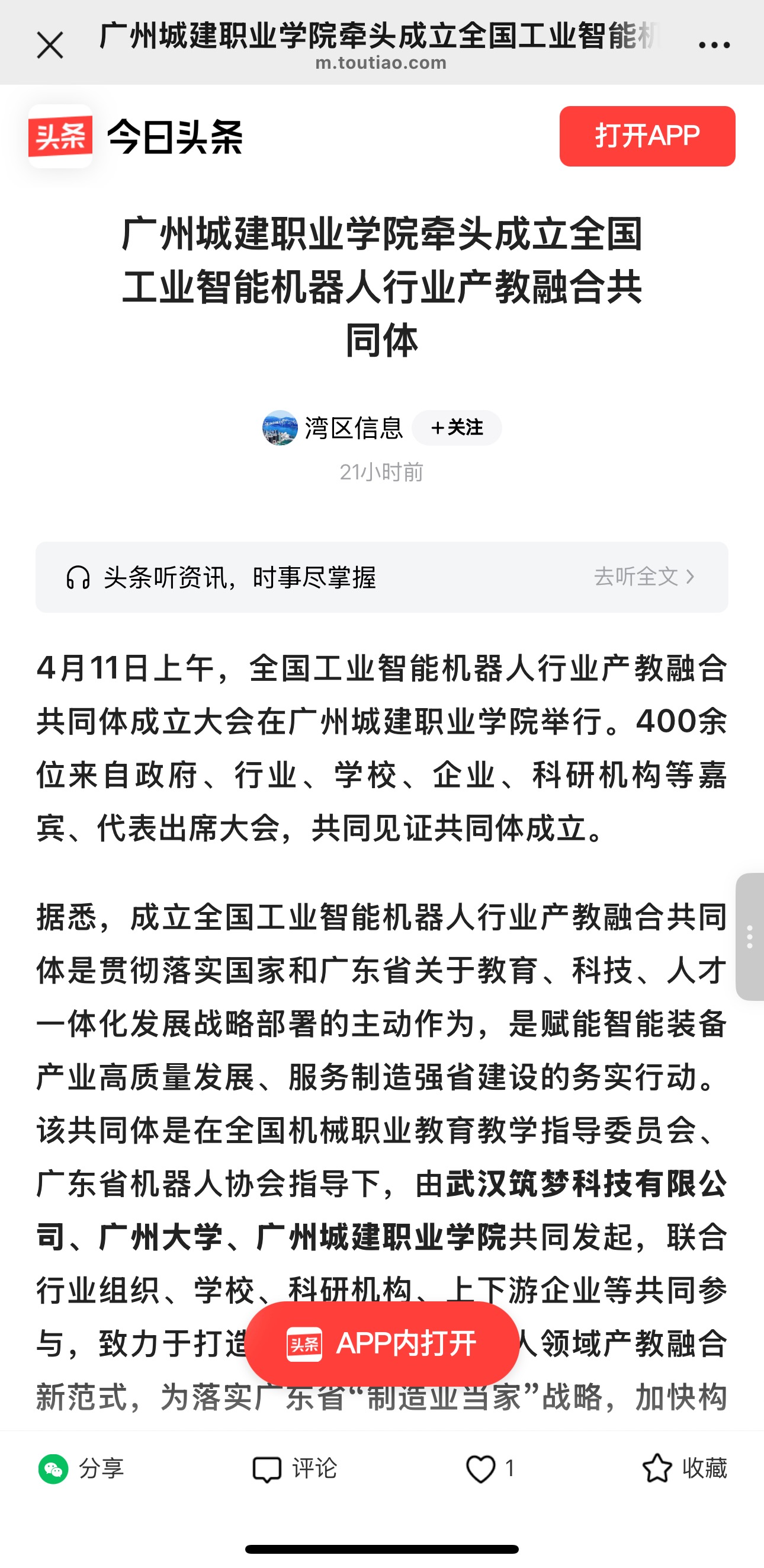 一直以来,广州城建职业学院在产教协同领域持续深耕,不仅携手华为、比亚迪等行业龙头共建6个特色产业学院,还牵头组建了清远佛冈产业园区产教联合体、全国数智营销及粤港澳大湾区智能建造等行业产教融合共同体,两度荣膺“中国东部地区产教融合卓越高等职业学校50强”。随着工业智能机器人技术已经进入产业与应用深度结合的爆发期,学校正积极构建符合区域经济发展的工业智能机器人行业产教供需对接机制,拓展该技术在职业教育领域中的应用,培养更多适应新技术、新业态的高素质技能人才、能工巧匠和大国工匠。