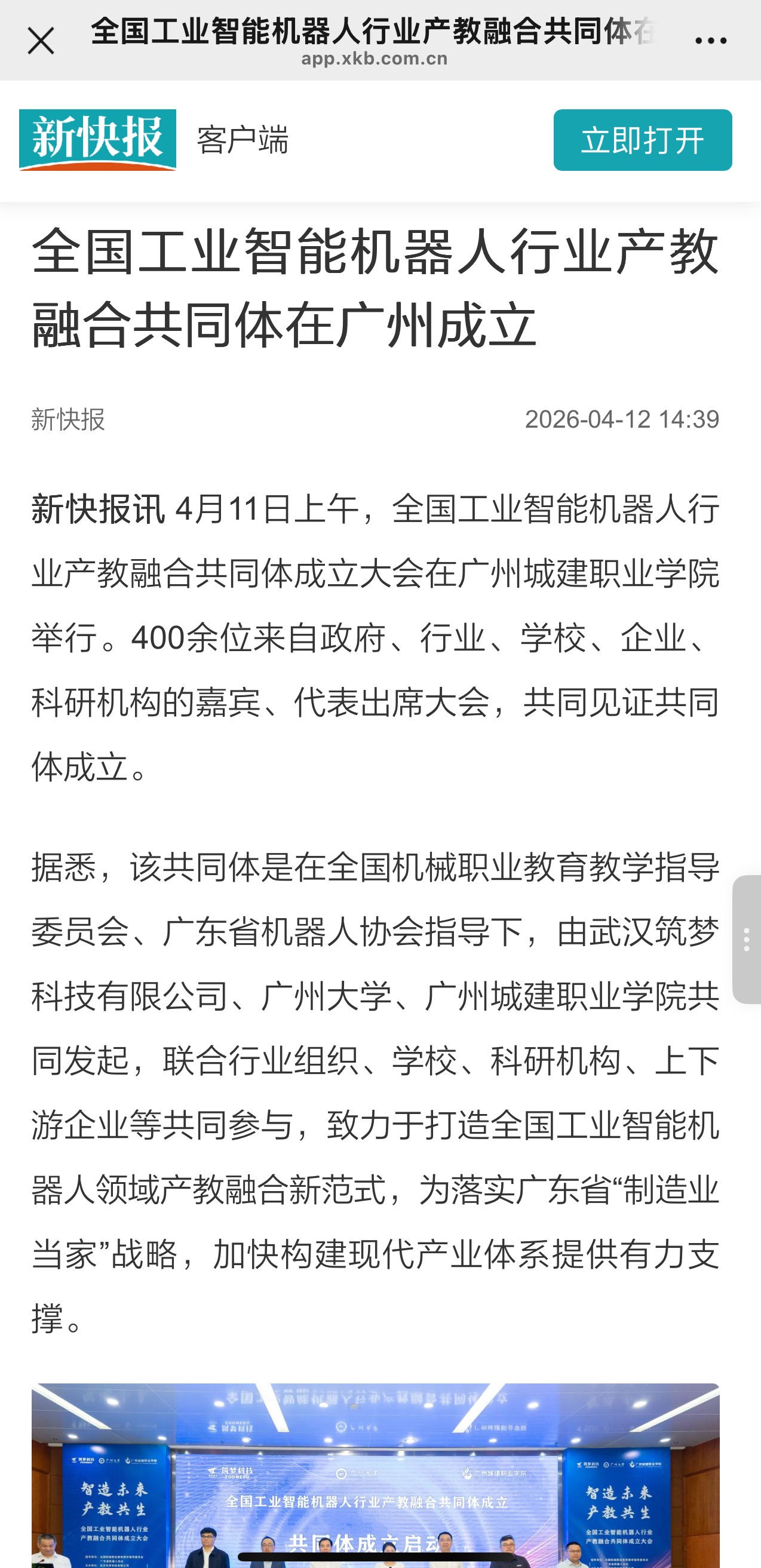 新快报讯 4月11日上午,全国工业智能机器人行业产教融合共同体成立大会在广州城建职业学院举行。400余位来自政府、行业、学校、企业、科研机构的嘉宾、代表出席大会,共同见证共同体成立。