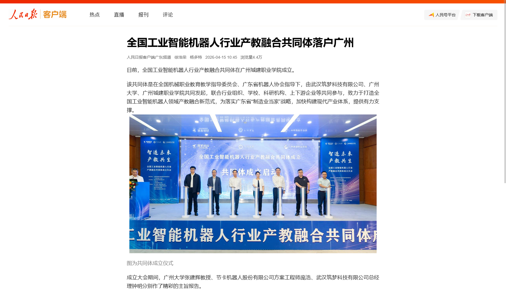 日前,全国工业智能机器人行业产教融合共同体在广州城建职业学院成立。