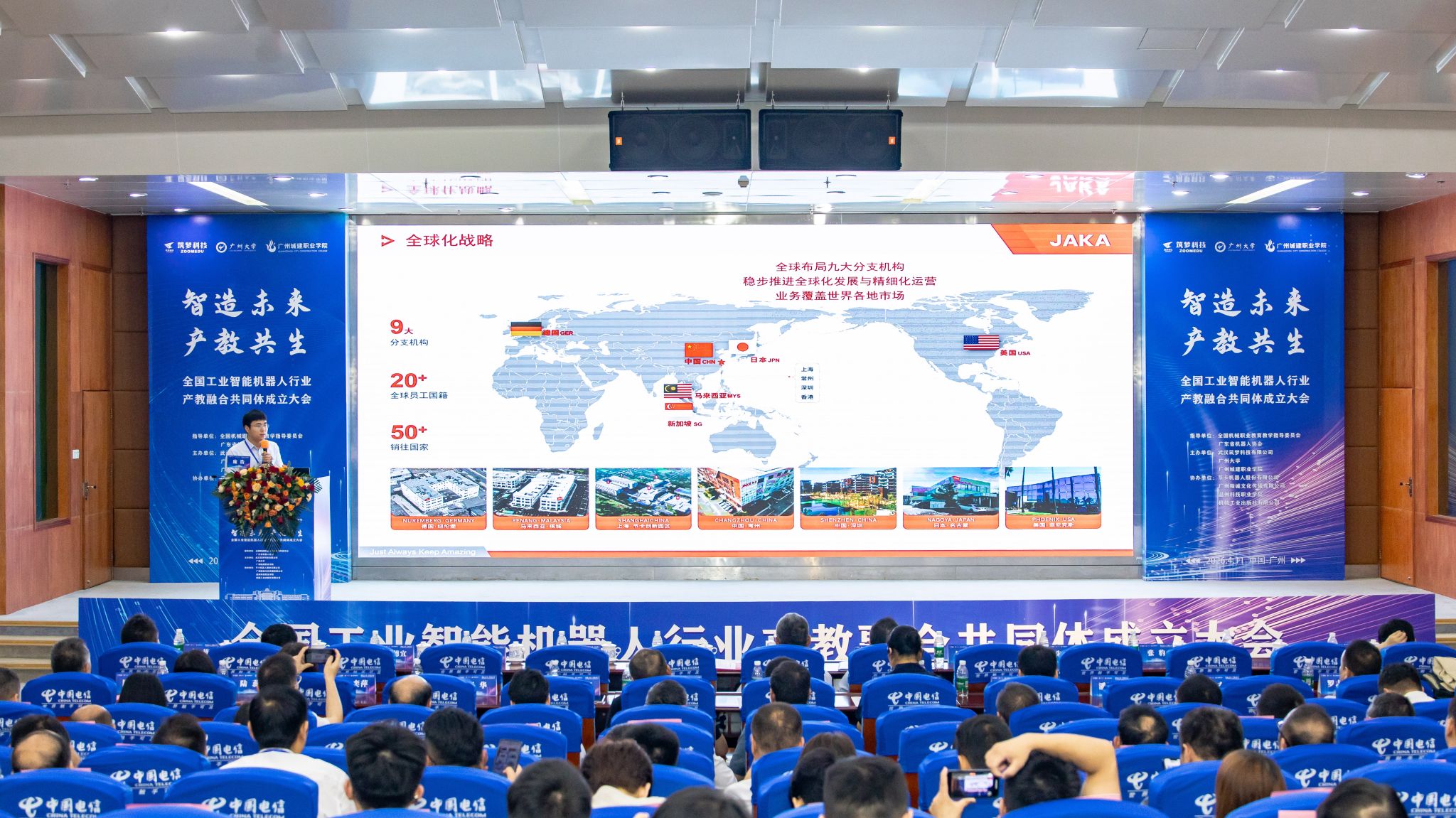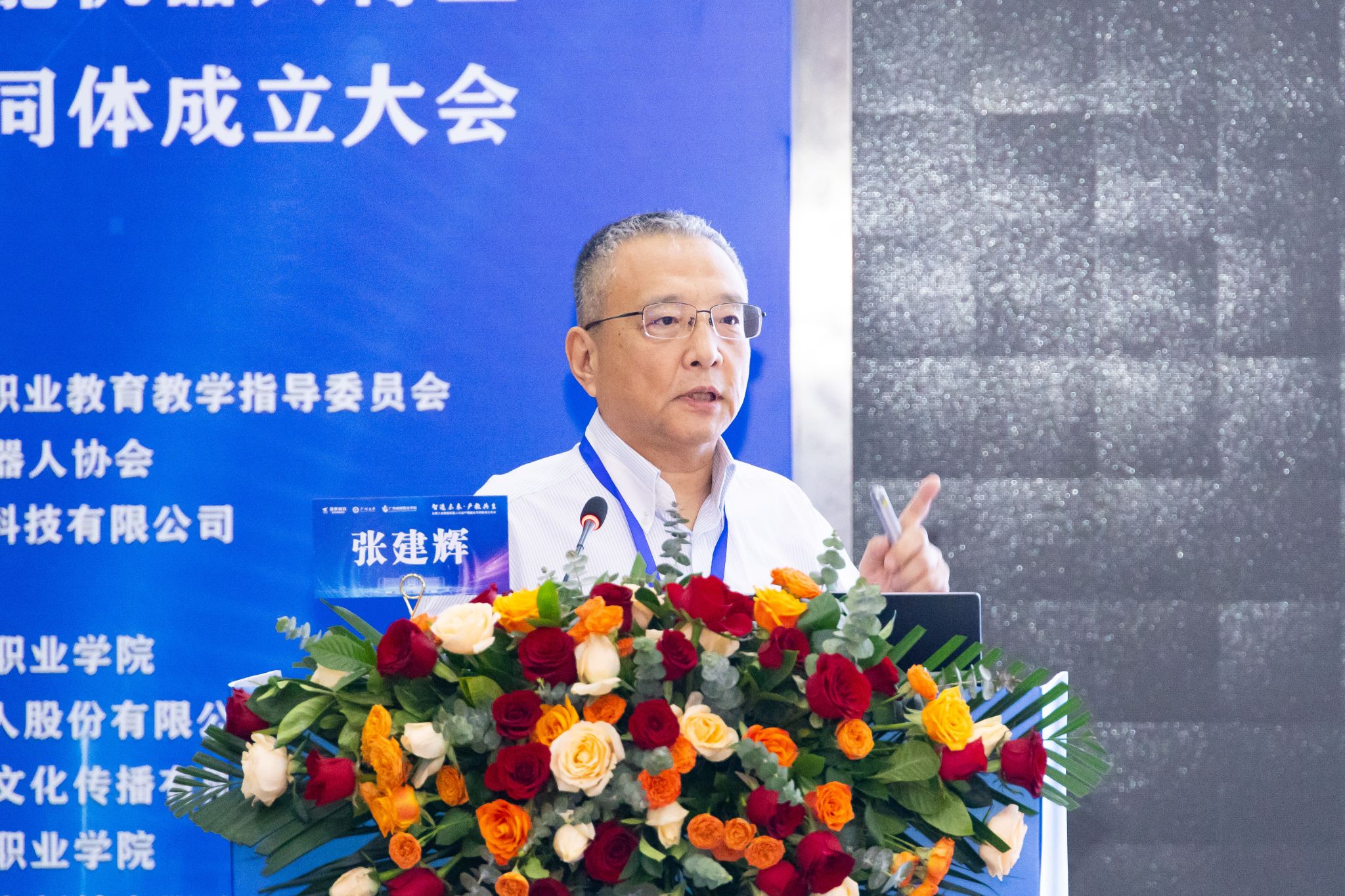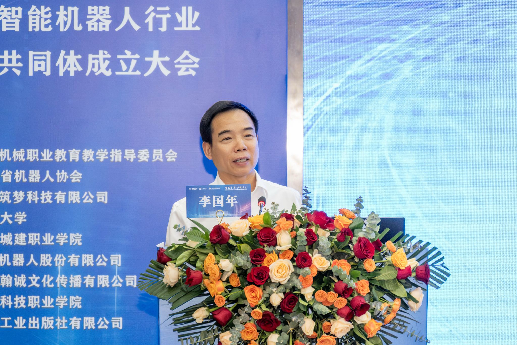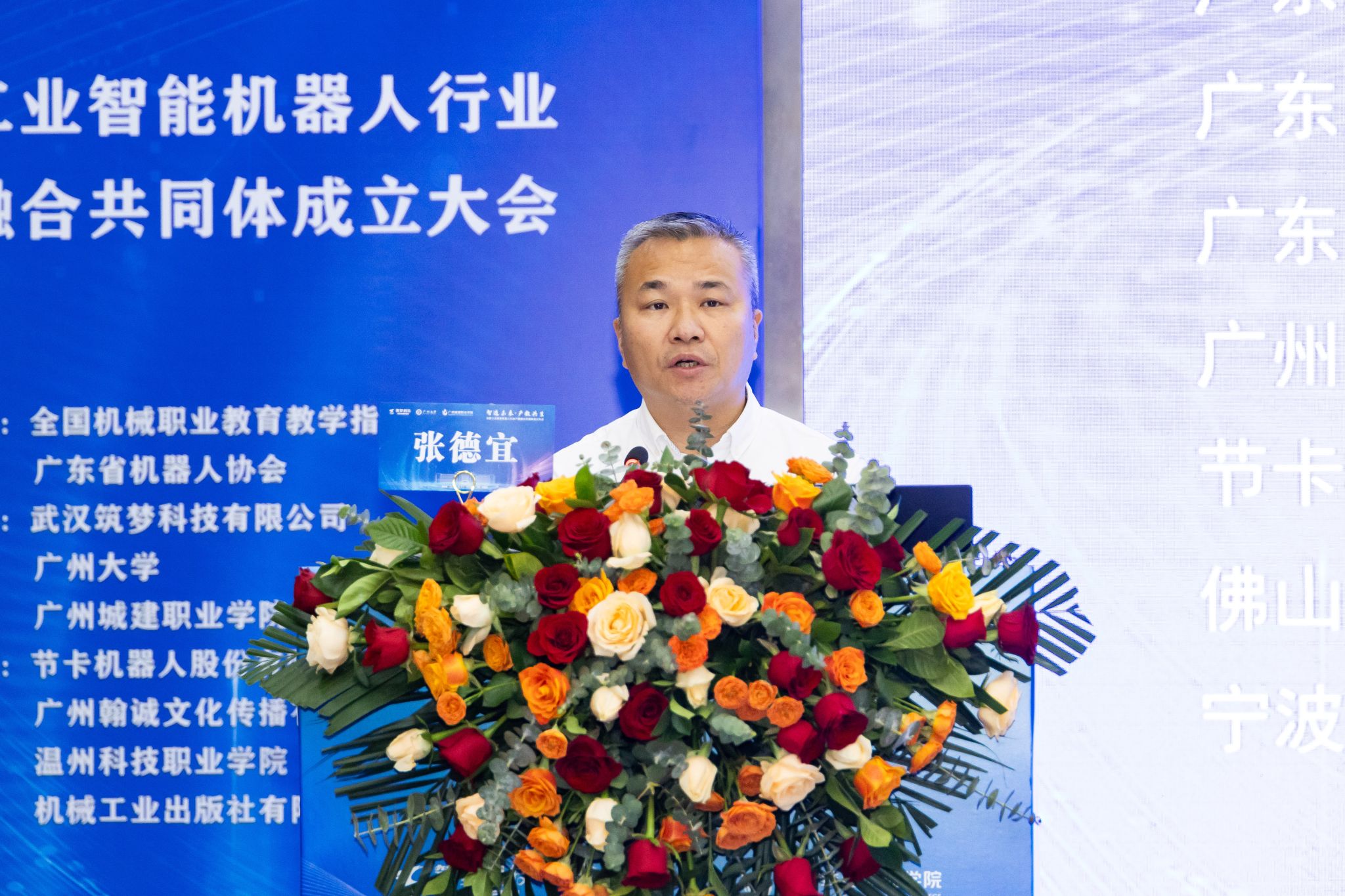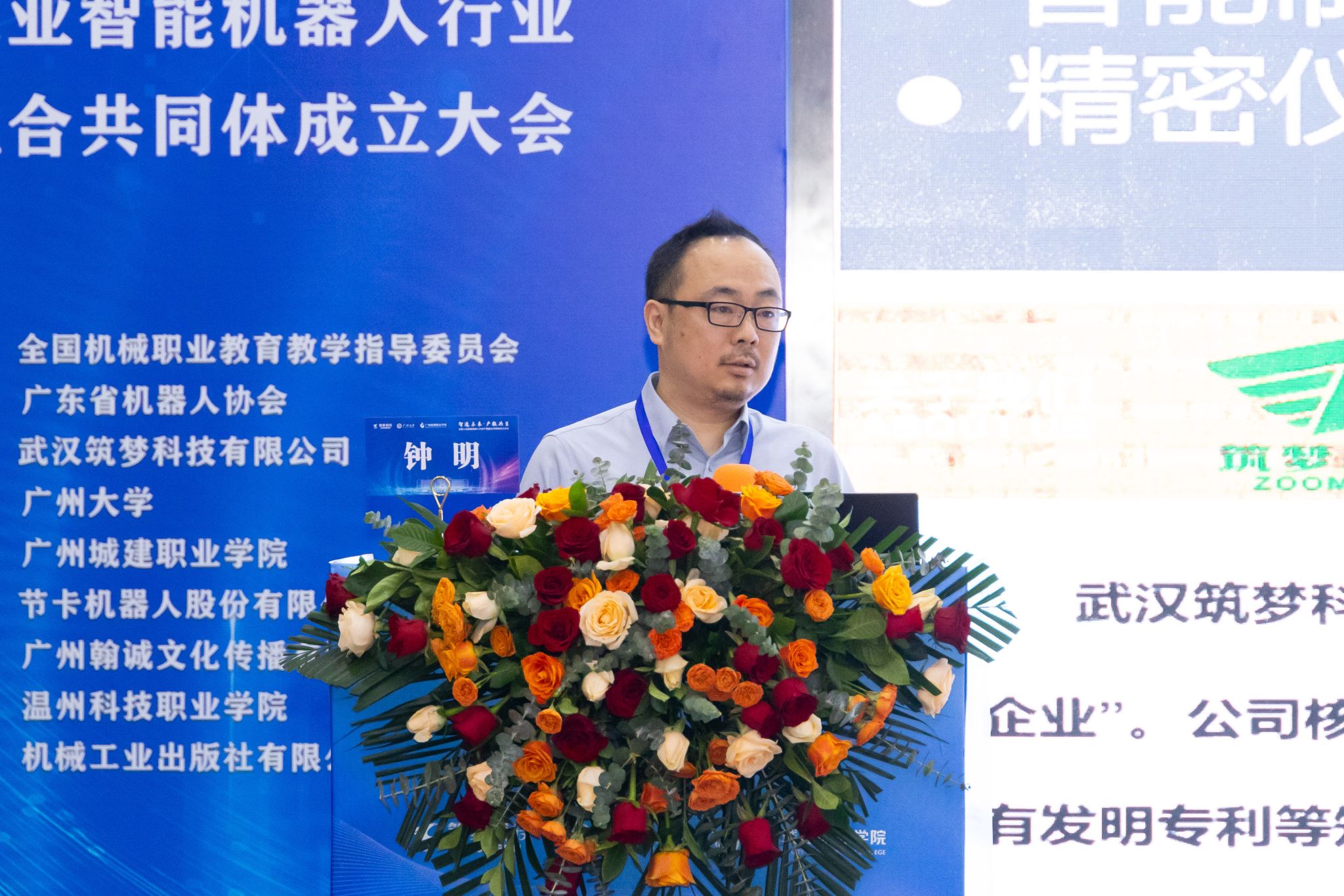 在全场嘉宾的共同见证下,机械工业教育发展中心发展研究处副处长王丹、广州大学党委副书记王国栋、武汉筑梦科技有限公司总经理钟明、广州城建职业学院校长李国年、广东省机器人协会执行会长任玉桐、节卡机器人股份有限公司副总裁杨卓、广州市从化区科工信局副局长朱健伟共同登台,启动“全国工业智能机器人行业产教融合共同体”。