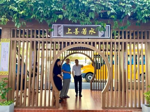 理论研讨结束后,在水头镇中心小学校长曾富强带领下,柏元海一行参观了该校两大特色建设项目——非物质文化遗产“舞猫头狮”文化馆与中草药种植园。