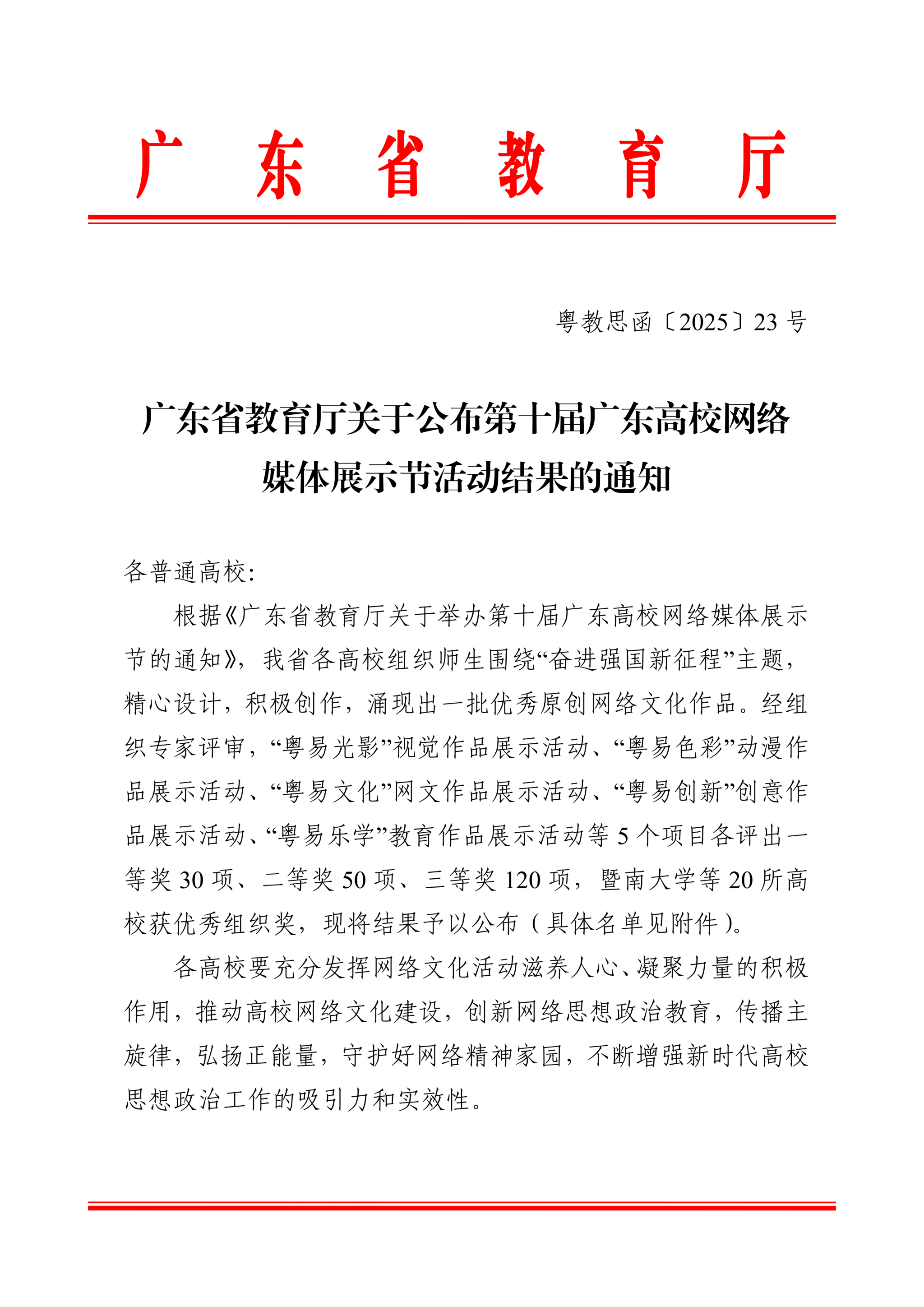 据悉,本届网络媒体展示节由广东省教育厅主办,以“奋进强国新征程”为主题,组织开展了“粤易光影”视觉作品、“粤易色彩”动漫作品、“粤易文化”网文作品、“粤易创新”创意作品、“粤易乐学”教育作品等5项展示活动,各评出一等奖30名、二等奖50名、三等奖120名,并评选优秀组织奖20名。活动开展以来,学校党委宣传部积极响应,广泛发动,精心组织作品征集与遴选工作,择优推荐优秀作品参加省级评选,获得佳绩。