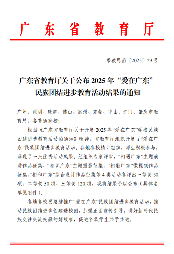 近日,广东省教育厅公布了2025 年“爱在广东”民族团结进步教育活动结果,我校师生作品在“相识广东”主题摄影作品征集和“相和广东”综合设计作品征集活动中荣获一等奖1项、二等奖2项、三等奖4项。