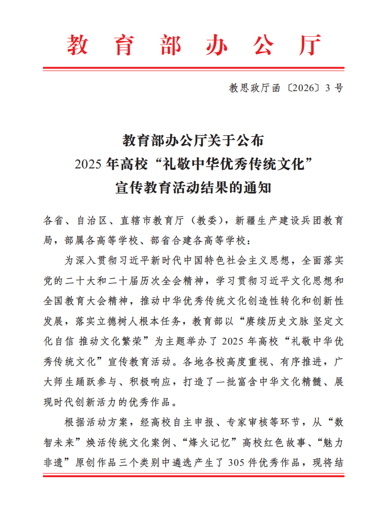 据悉,本次活动由教育部主办,经全国各高校自主申报、专家评审等环节,共遴选出“数智未来”焕活传统文化案例优秀作品103件、“烽火记忆”高校红色故事优秀作品100件、“魅力非遗”原创优秀作品102件。在本次推荐申报工作中,学校高度重视,在党委宣传部的有序推进下,广大师生踊跃参与、积极响应,最终作品入选,充分展现了我校在文化传承与创新方面的丰硕成果。