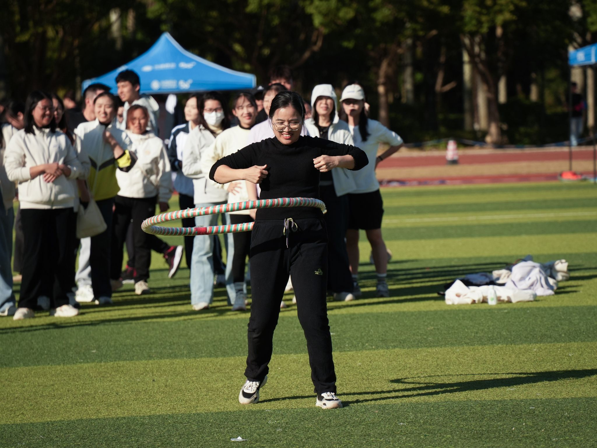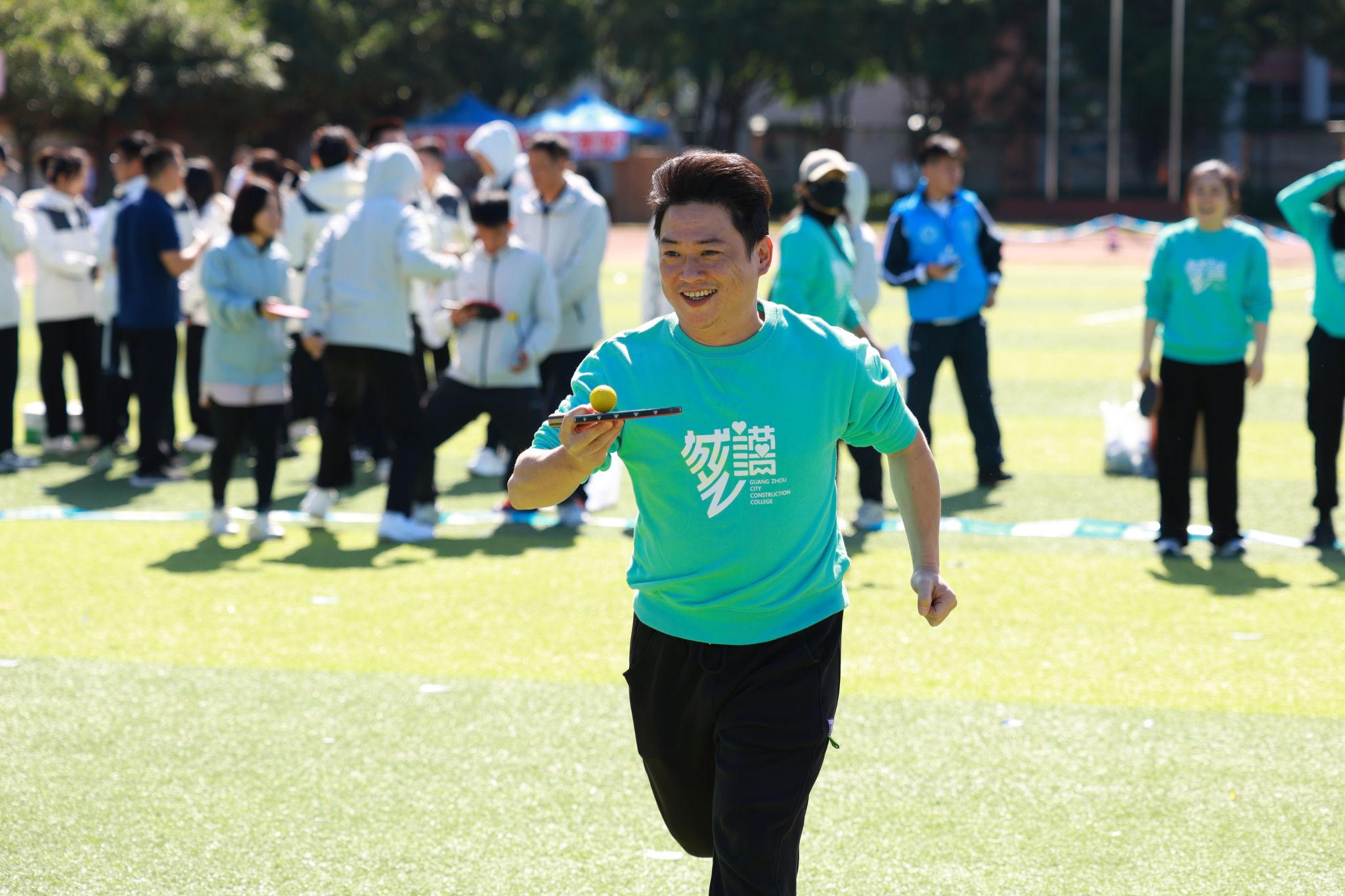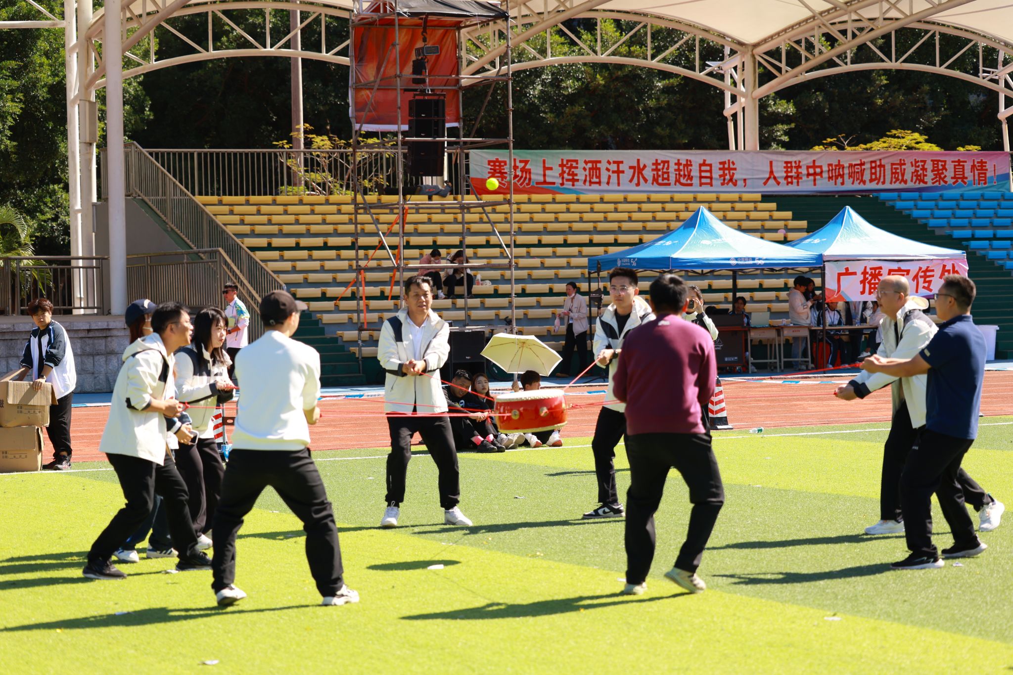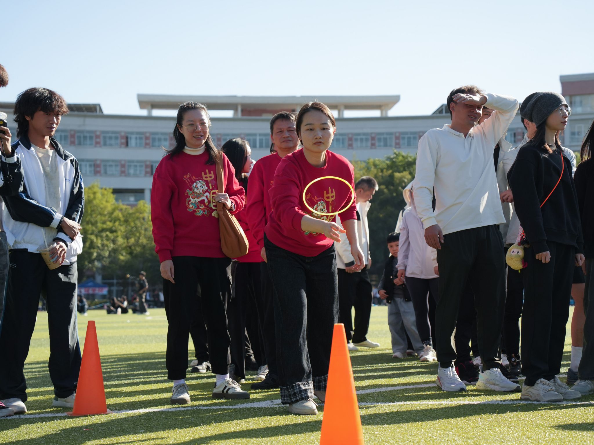 教职工组的比拼同样精彩纷呈。赛事设置充满趣味与温情,团体项目中,拔河的全力以赴、乒乓球接力赛的稳健迅捷、传呼啦圈的灵活默契、混合接力跑的团结协作,展现出浓厚的团队精神;个人项目中,捶丸的专注、呼啦圈的灵动、蒙眼敲锣的趣味、竞走的坚持、套圈的精准,每个项目都引来阵阵喝彩。老师们暂离讲台,在赛场上展现出活力四射、昂扬向上的别样风采,赢得了全场观众的掌声与欢呼。