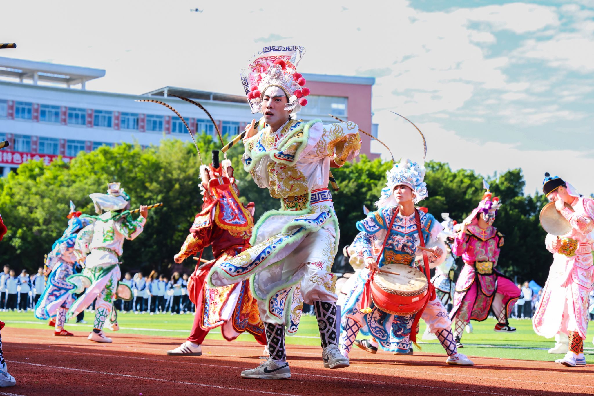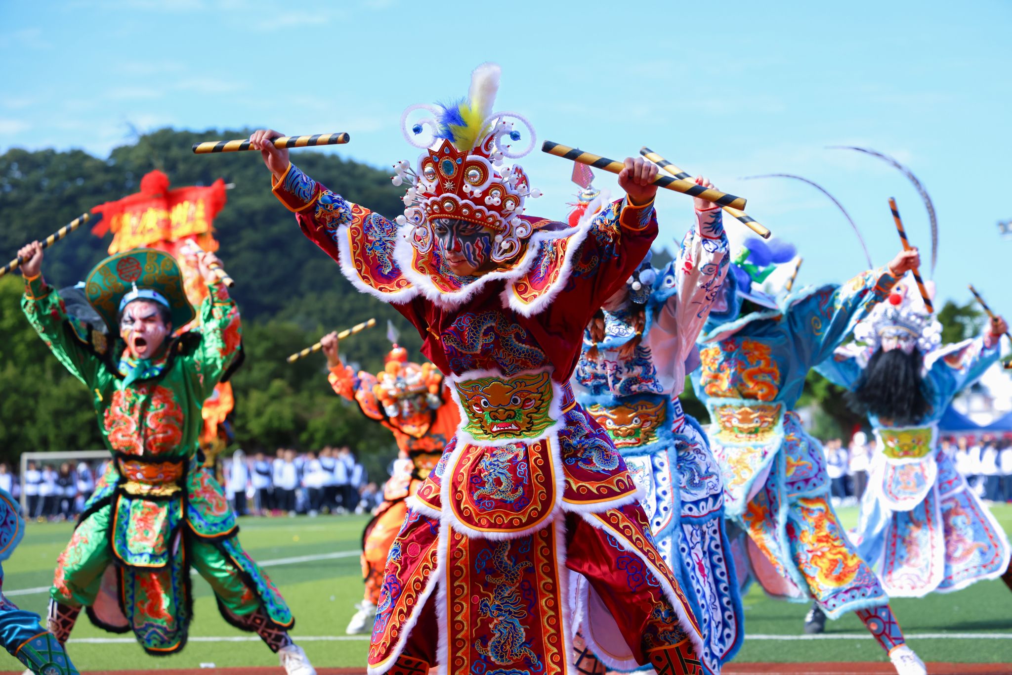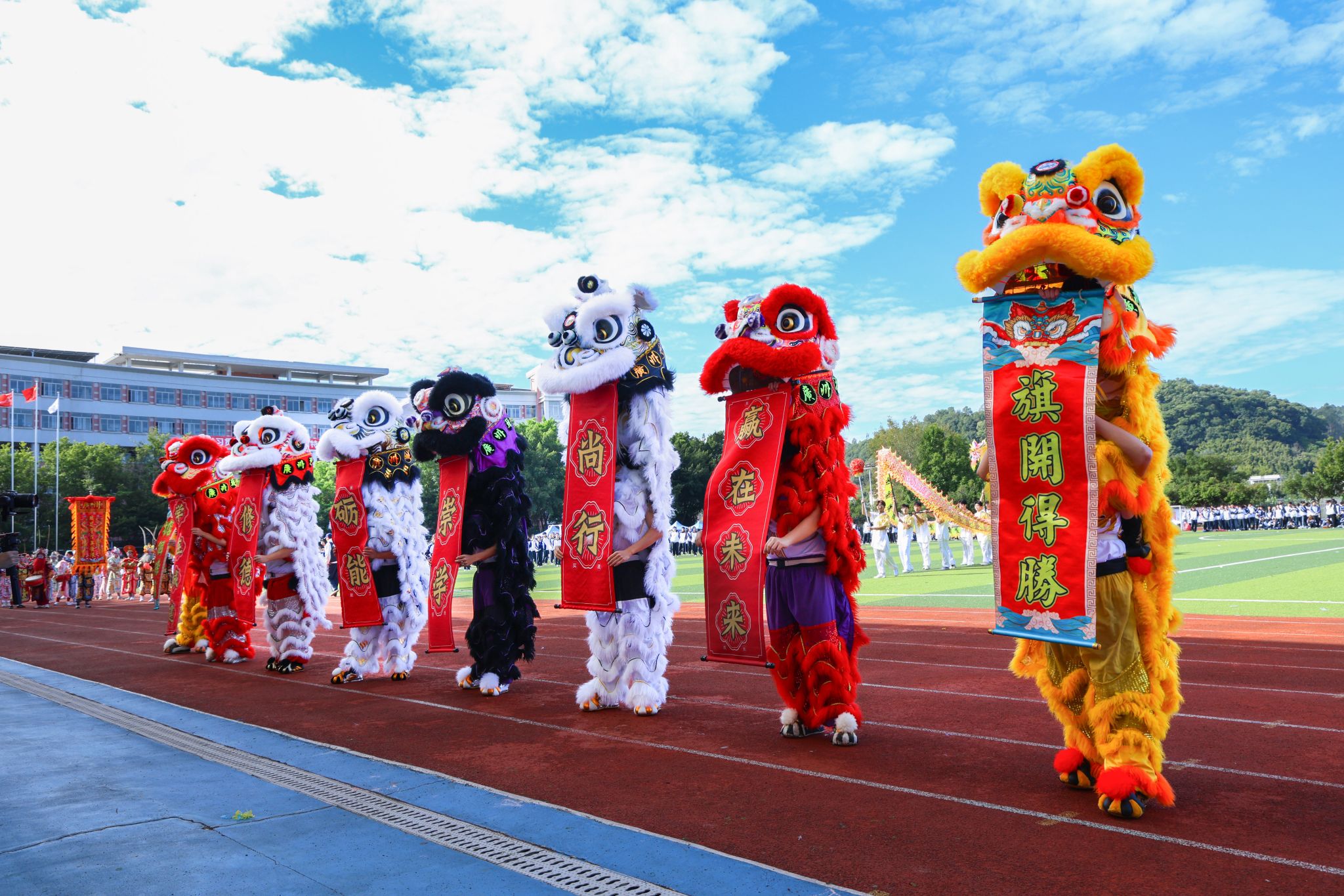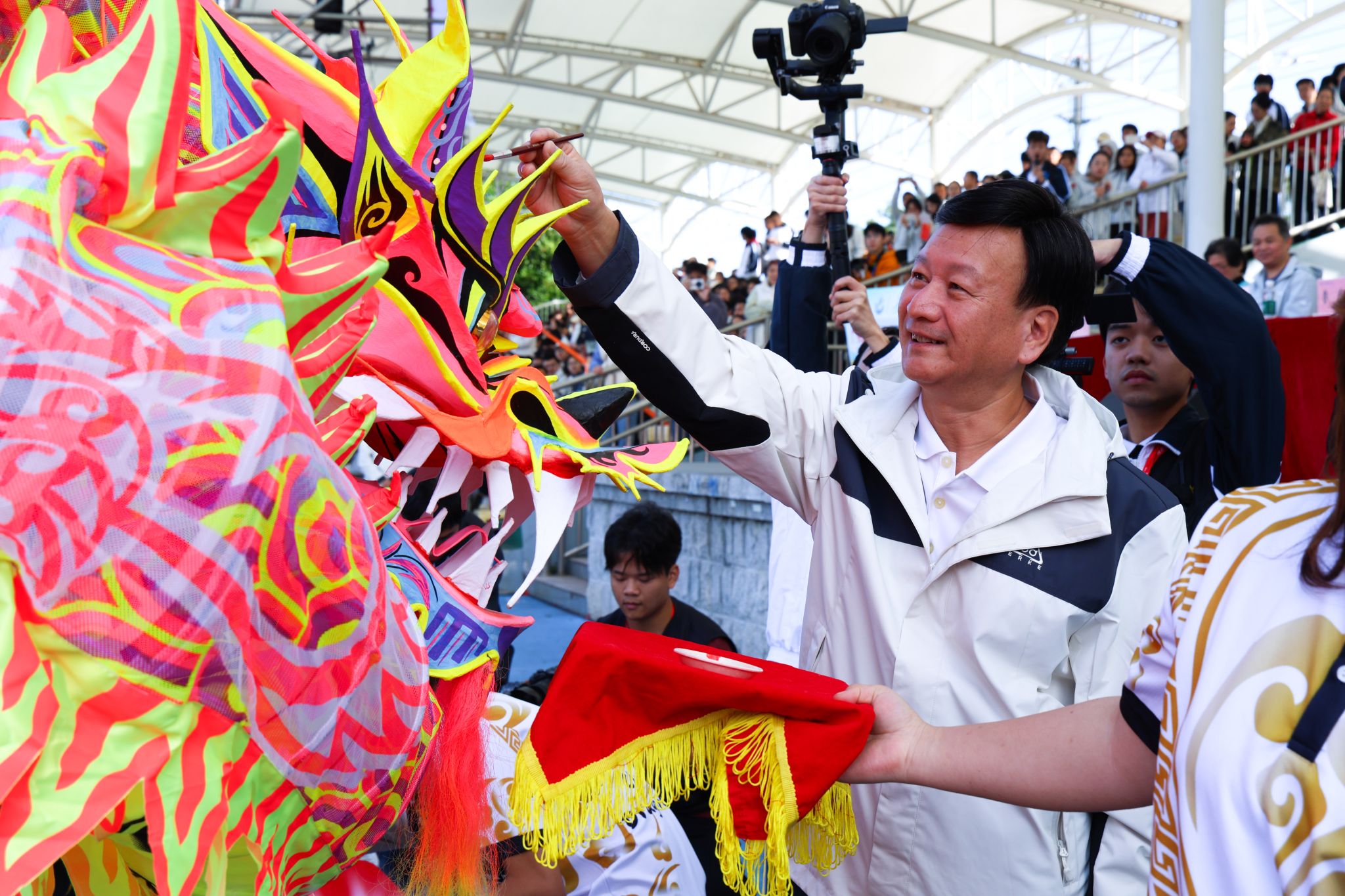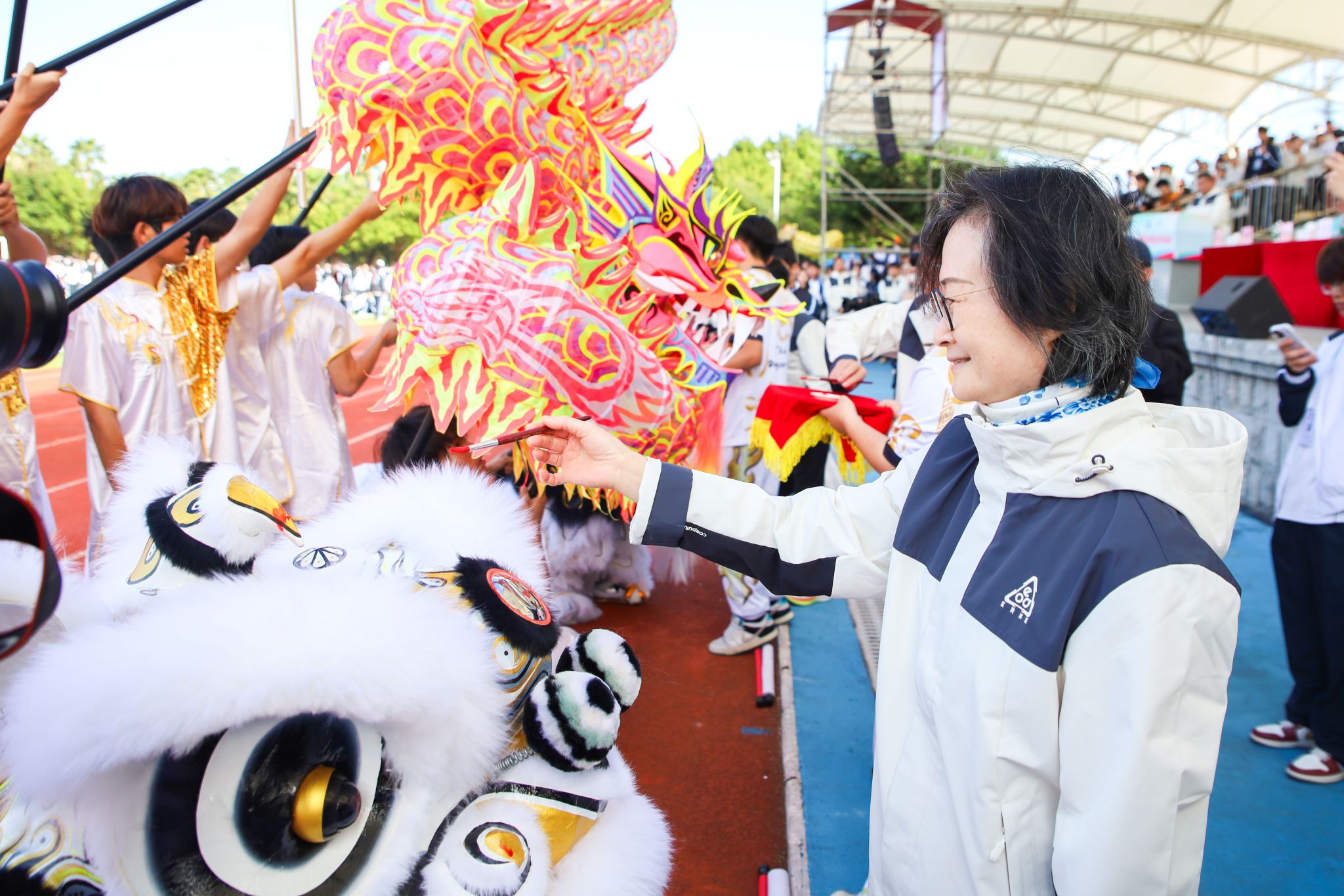 开幕式上,张亚斌、黄学茭、李国年共同执笔,为新龙和新狮子点睛。接着,一系列精彩表演轮番上演,刚劲威猛的龙狮表演,舞动出传统文化的雄浑气韵;气势磅礴的英歌舞,跃动着青春的节奏与力量;柔和连绵的千人八段锦,在一招一式中蕴藏着动静相生的养生智慧;最后,活力四射的千人啦啦操表演瞬间点燃全场激情,为运动健儿加油助威。