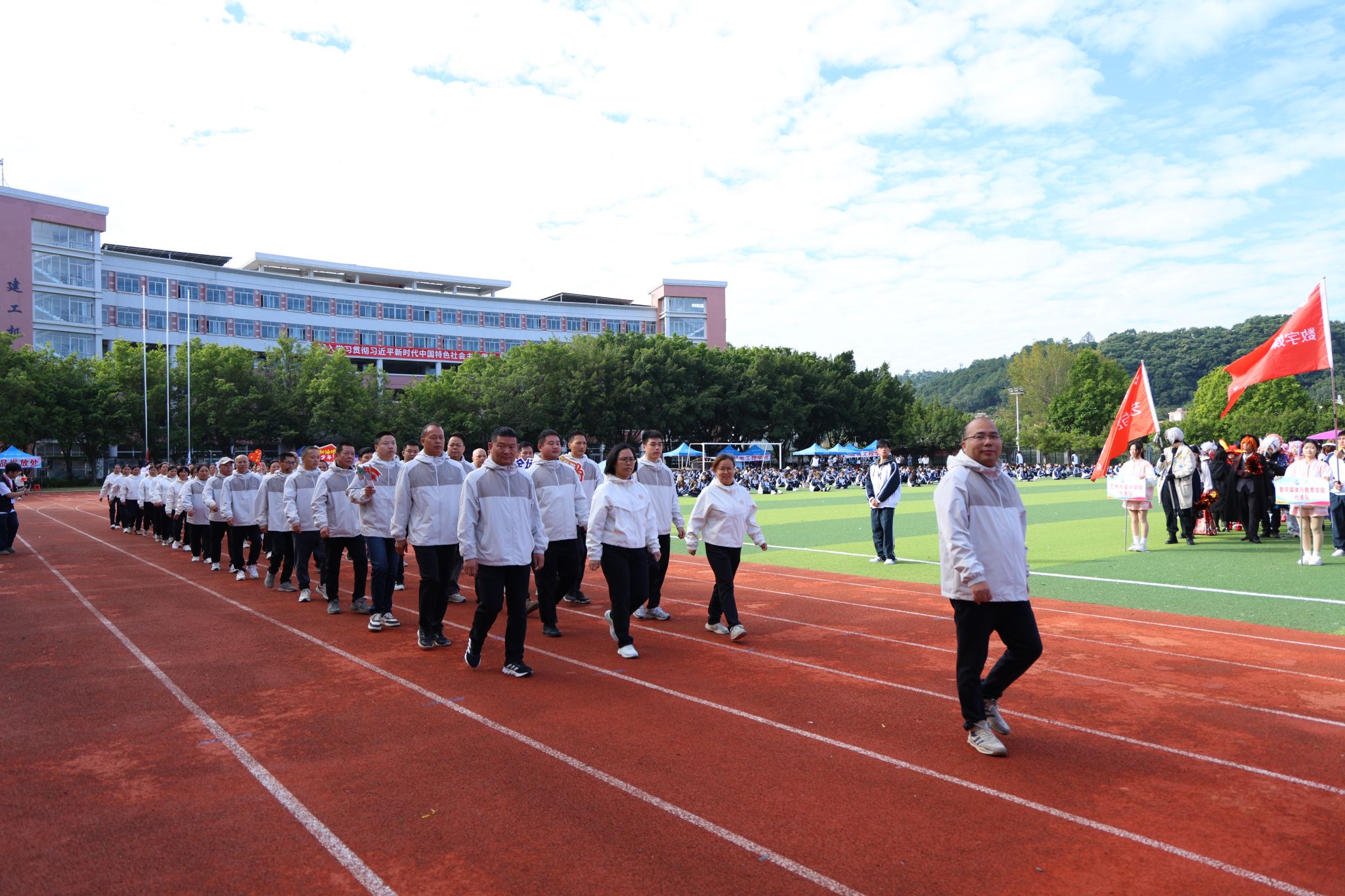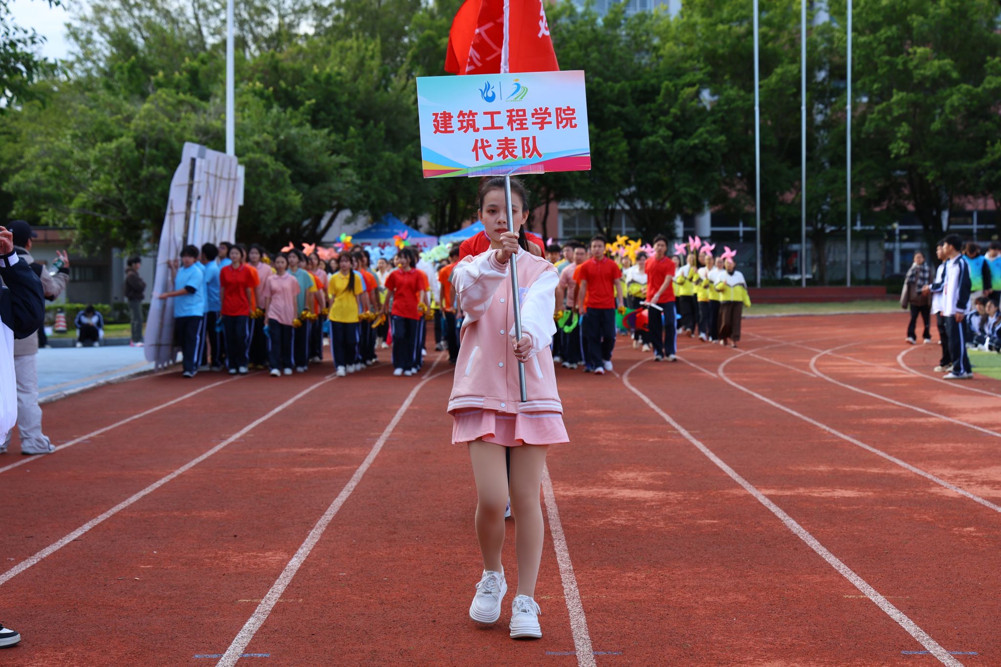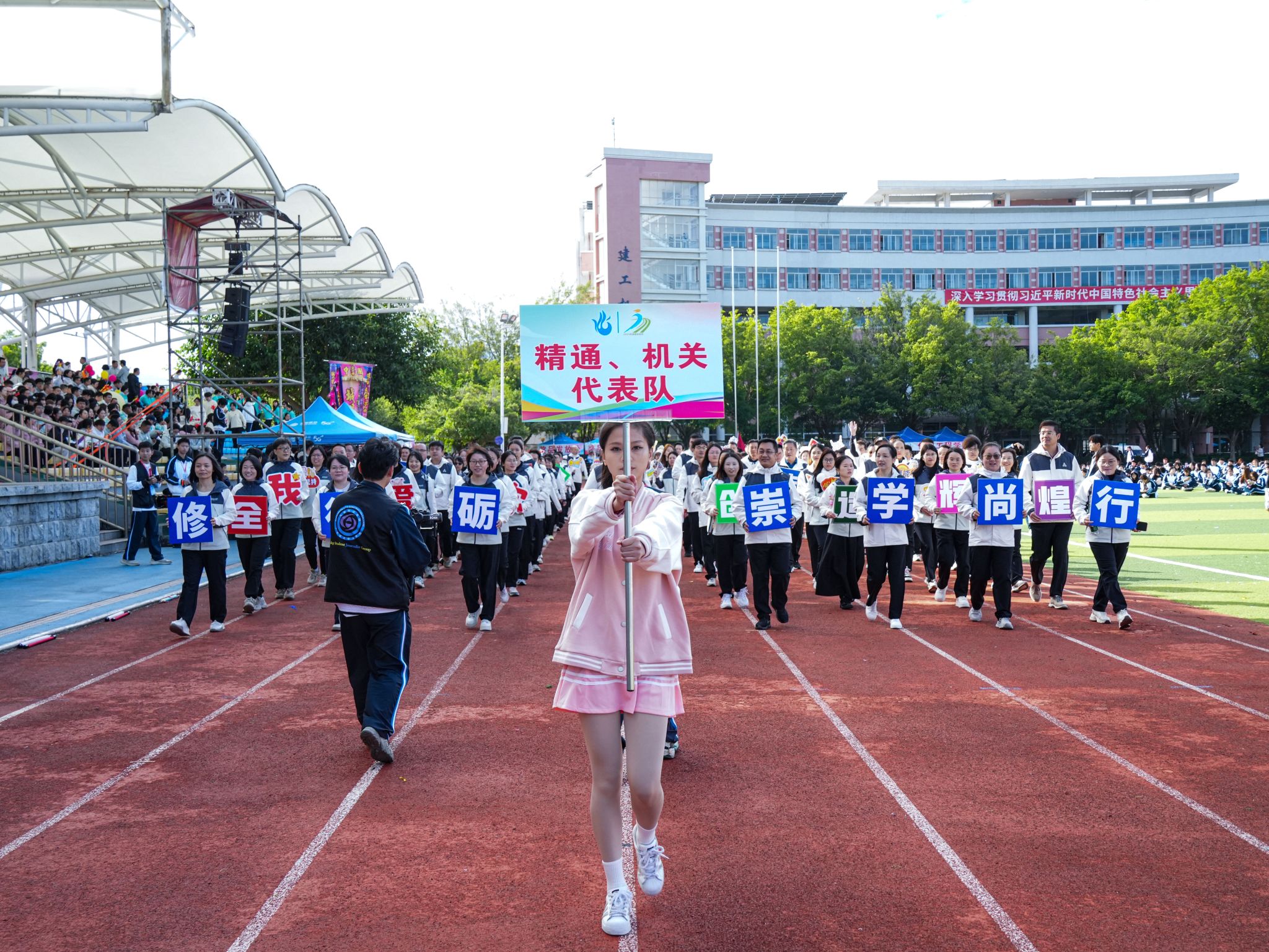伴随着雄壮激昂的《运动员进行曲》,国旗、校旗、运动会会旗、裁判员、十五运会和残特奥会志愿者、各二级学院、机关、保卫、后勤等方阵逐一亮相,有序入场。他们精神抖擞,口号响亮,创意迭出,以昂扬风貌展现了城建人的蓬勃朝气与强大凝聚力。