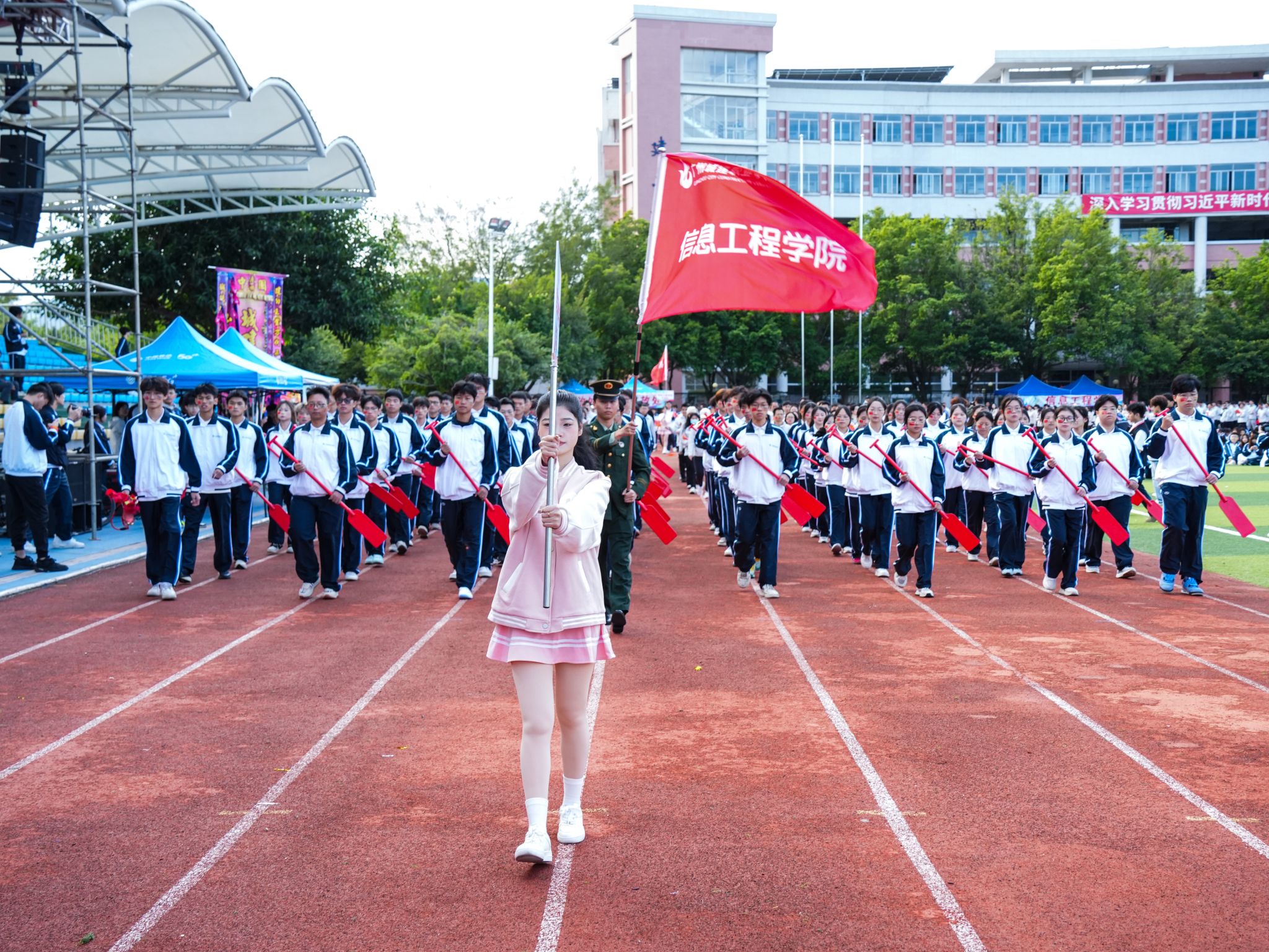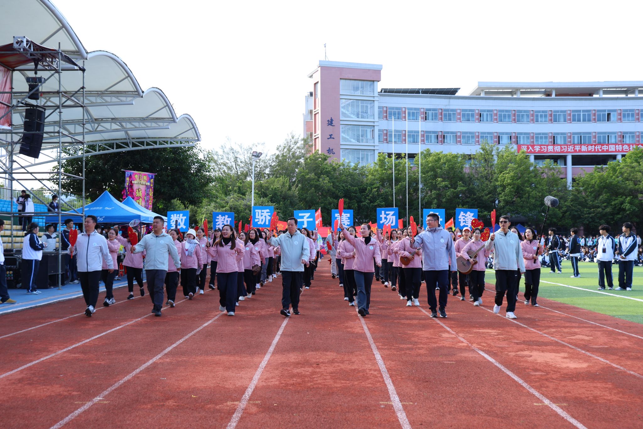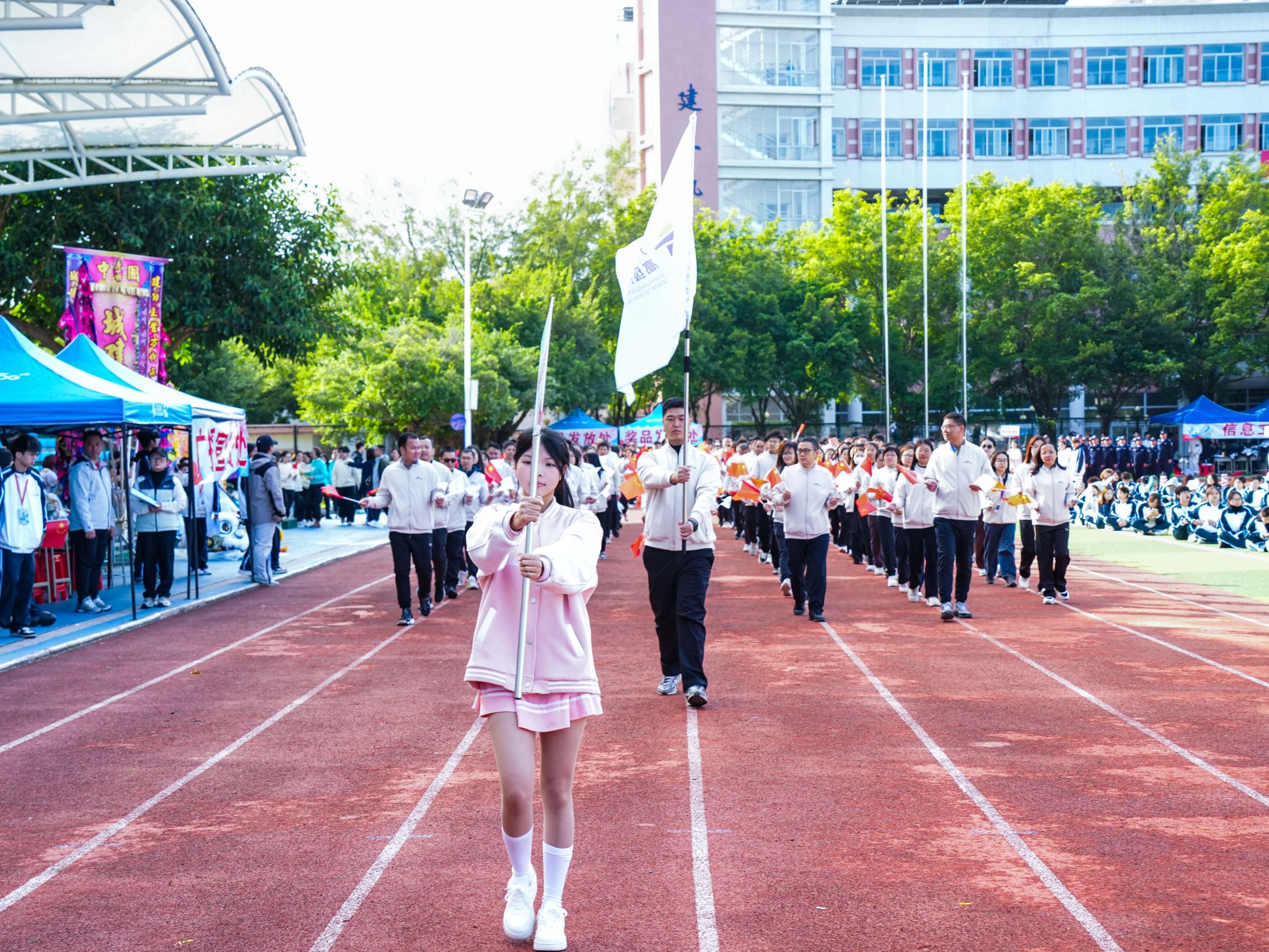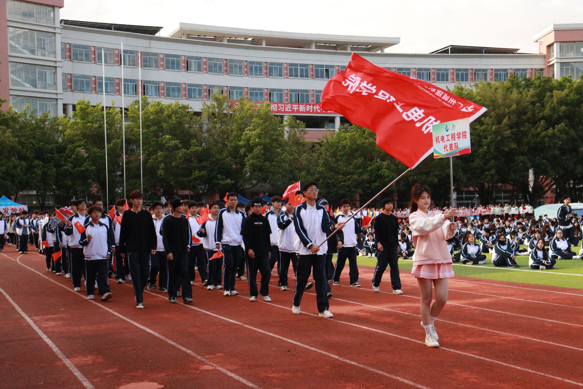 伴随着雄壮激昂的《运动员进行曲》,国旗、校旗、运动会会旗、裁判员、十五运会和残特奥会志愿者、各二级学院、机关、保卫、后勤等方阵逐一亮相,有序入场。他们精神抖擞,口号响亮,创意迭出,以昂扬风貌展现了城建人的蓬勃朝气与强大凝聚力。
