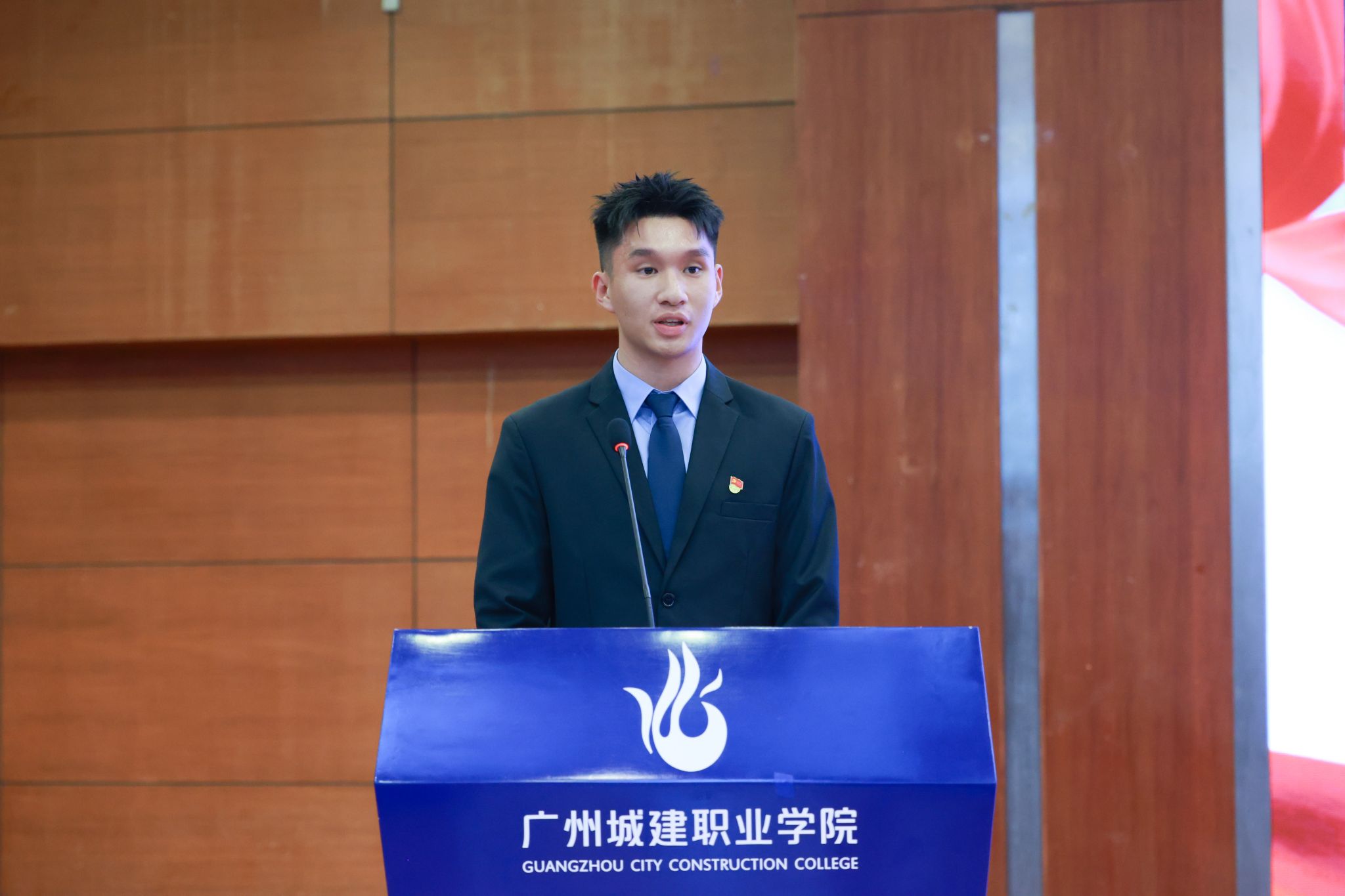 甄伟文讲话。他指出,学生“榜样人物”评选活动是学校深入学习贯彻习近平新时代中国特色社会主义思想和党的二十大精神、推动“灯塔工程”落地见效的重要载体。活动通过挖掘身边可学可做的先进典型,让榜样力量直抵心灵,将“修德、砺能、崇学、尚行”的校训精神具象化为鲜活故事,展现青年学子昂扬向上的精神风貌。他号召全校同学以榜样为镜、为标、为力,掀起“学习榜样、崇尚榜样、争当榜样”的热潮,将内心触动转化为实际行动,在专业领域深耕不辍,在集体需要时挺身而出,在日常生活中严于律己,让榜样精神在校园蔚然成风。