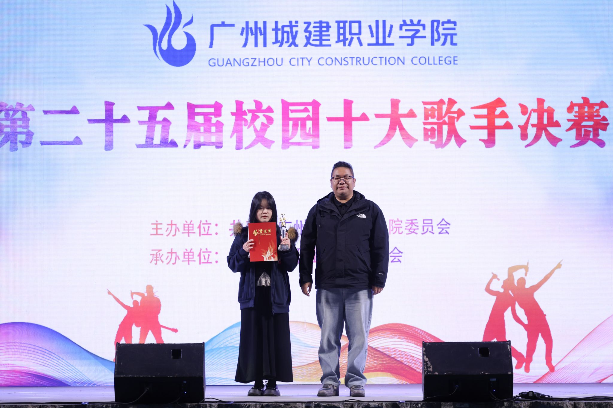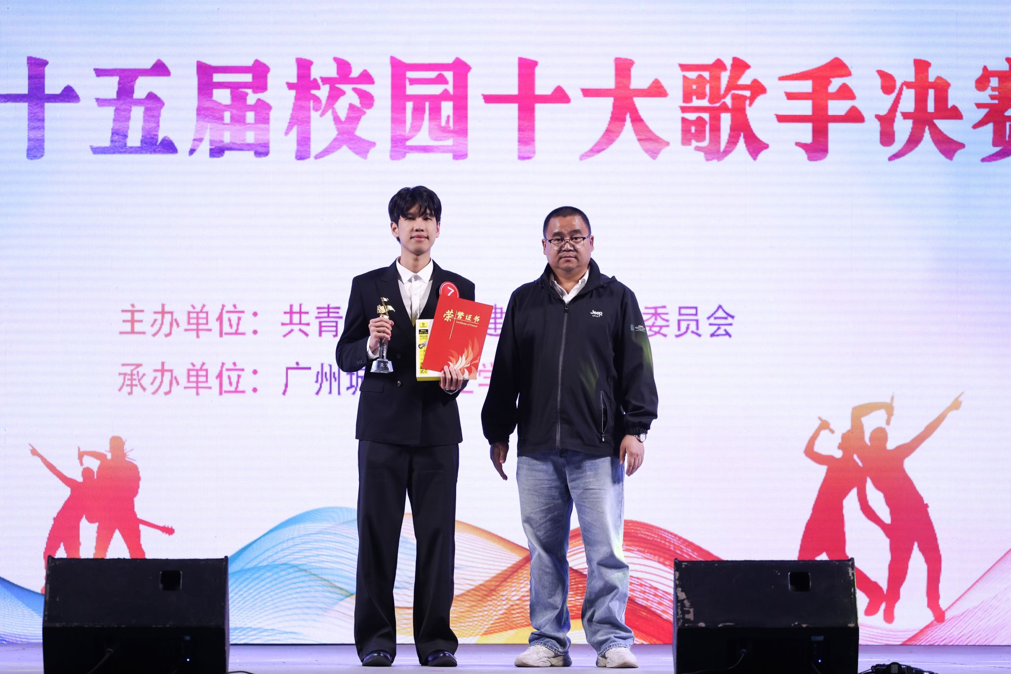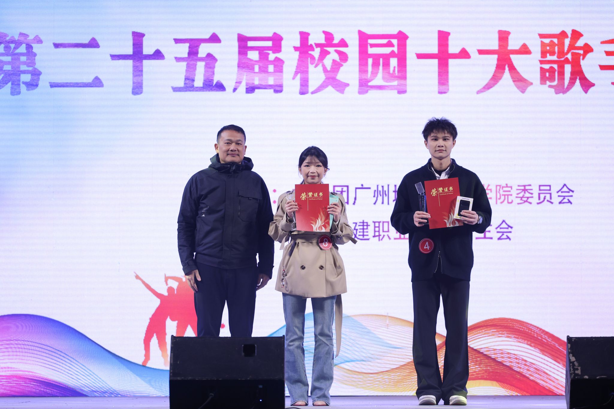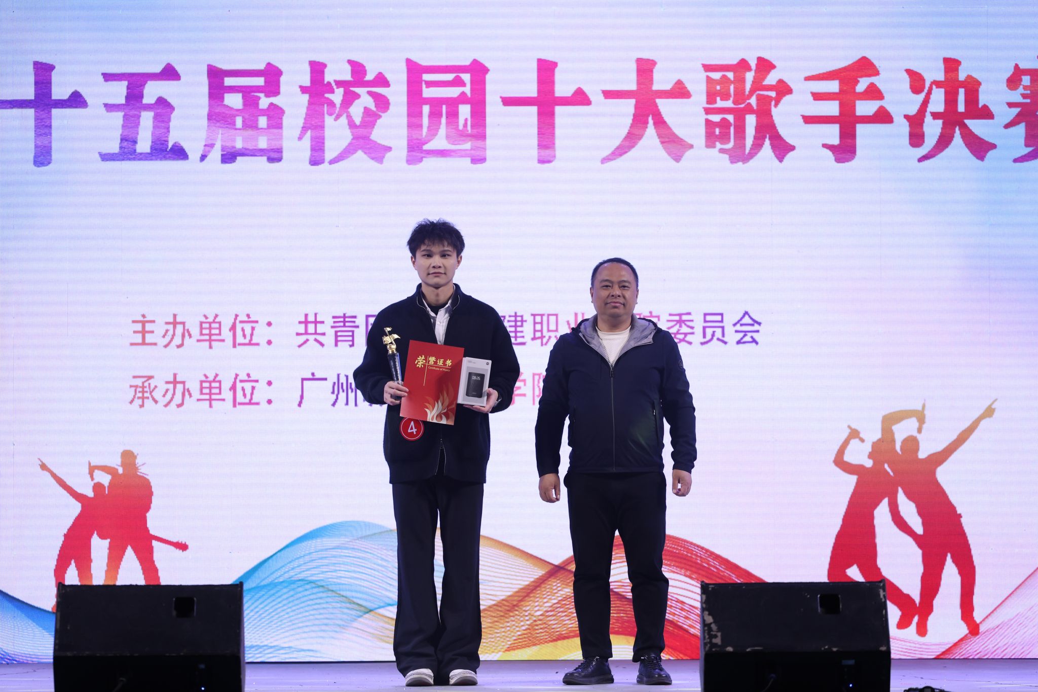 经过激烈的角逐,陈钰沣同学荣获冠军,蔡冰杰、张婉怡同学分别荣获亚军、季军,陈彦亘、唐冰冰、施珈宇、余汶桦、舒俪颖、李昊烨、张滢滢荣获“十大歌手”称号,陈钰沣、余汶桦同学分别荣获最具台风奖和最佳人气奖。与会领导为获奖选手颁奖。