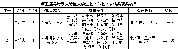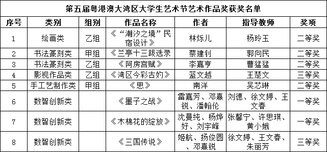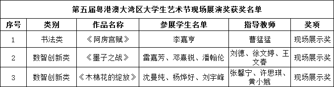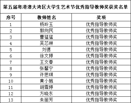 近日,广东省教育厅公布了第五届粤港澳大湾区大学生艺术节获奖名单,我校在此次活动中表现优异,获一等奖3项、二等奖5项、三等奖2项、现场展示奖3项,13名教师获评“优秀指导老师”,获奖等级与数量均实现历史性突破。