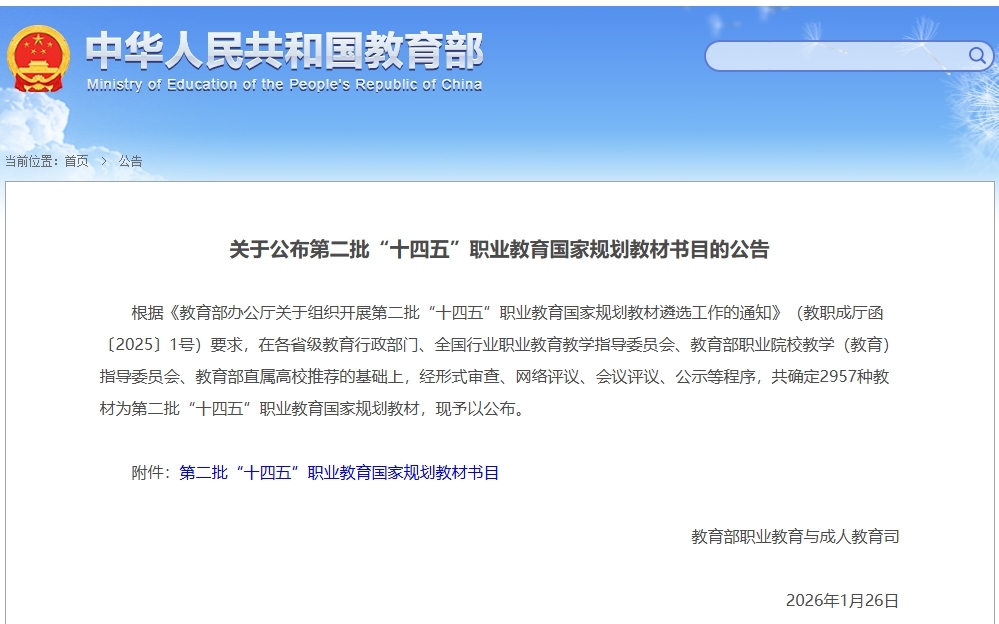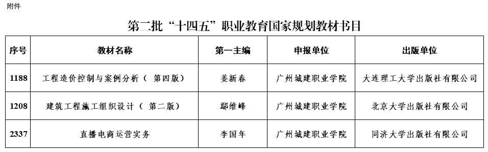 近日,教育部发布《关于公布第二批“十四五”职业教育国家规划教材书目的公告》,我校教师主编的《工程造价控制与案例分析(第四版)》、《建筑工程施工组织设计(第二版)》和《直播电商运营实务》3种教材成功入选。