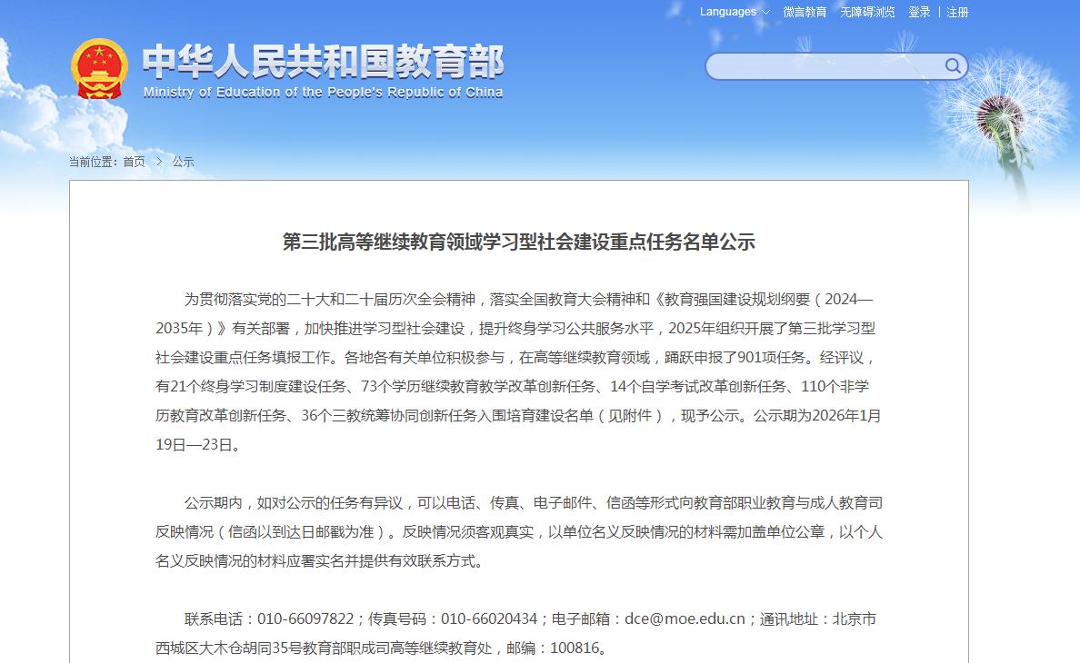 本次申报面向全国高等继续教育领域,共有901项任务参与评选。经教育部组织专家评议,最终确定入围培育建设的名单包括:终身学习制度建设任务21个、学历继续教育教学改革创新任务73个、自学考试改革创新任务14个、非学历教育改革创新任务110个以及三教统筹协同创新任务36个。