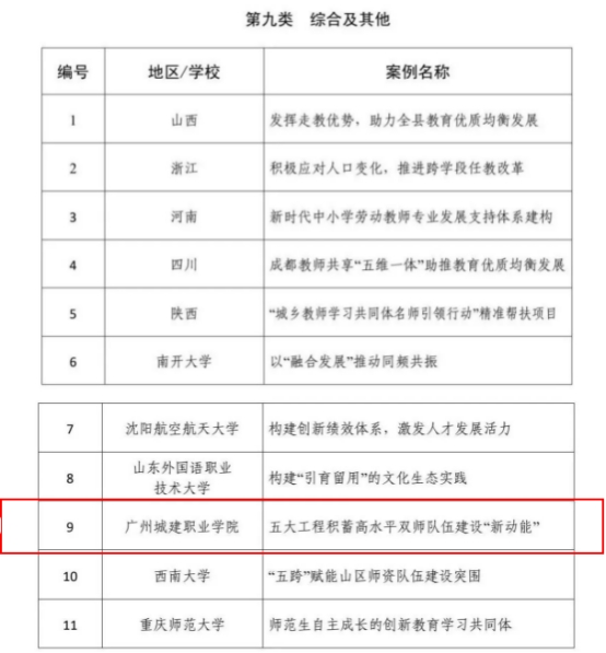 近日,在教育部教师工作司指导下,由中国教育报刊社牵头组织征集、编制的“新时代高水平教师队伍建设创新案例(2025)”正式发布。我校申报的案例《五大工程积蓄高水平双师队伍建设“新动能”》成功入选。根据统计,本次入选的149个案例中仅有11个来自高职院校,我校系广东省唯一一所入选案例的高职院校。