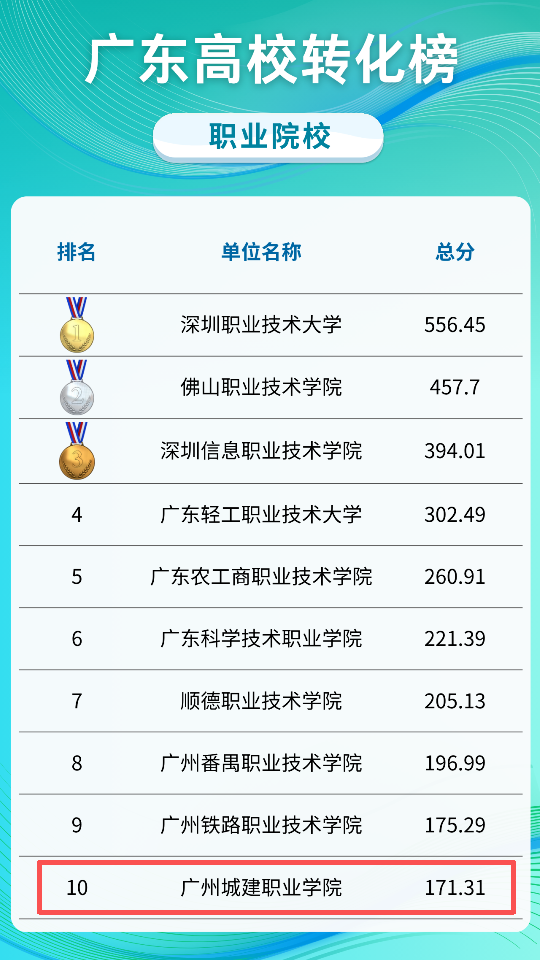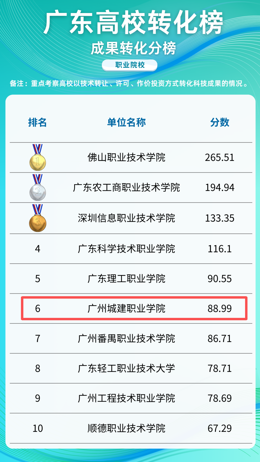 近日,广东高校科技成果转化中心发布“2024广东高校转化榜——职业院校”。该榜单围绕转化基础、成果转化、产学研合作、创新创业四个维度,结合27项细分指标,对全省162所高校的科技成果转化能力进行综合评估。我校以总分171.31分的优异成绩位列全省职业院校第十,并在成果转化、创新创业两个专项榜单中分获第六名和第二名。