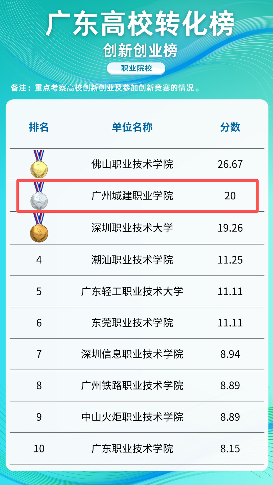 在聚焦创新创业与竞赛成果的“创新创业分榜”中,我校以满分成绩位列全省第二。作为广东省大学生创新创业教育示范校,学校持续探索创新创业教育路径,构建起“价值引领、课程驱动、平台赋能”高职学生创新创业能力培养模式,建设了包括1门国家级“名师优课”、2门省级就业创业特色示范课程、1门省级就业创业金课等在内的一批品牌课程。平台建设方面,拥有3个广州市众创空间、1个创业孵化基地和1个青年众创空间,累计培育312家科技型企业,年产值达亿元。2024年,学校注册企业24家,获得投资企业5家,展现了创新创业教育的扎实成效。在竞赛方面,学校在中国国际大学生创新大赛(2024)中荣获银奖2项、铜奖4项,累计已获金奖2项、银奖7项、铜奖13项,总成绩位列全国同类院校第一。