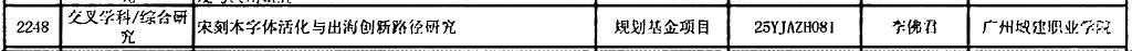 11月29日,教育部社会科学司发布《教育部社科司关于2025年度教育部人文社会科学研究一般项目立项的通知》(教社科司函〔2025〕16号),我校艺术与设计学院副院长、特聘教授李佛君博士主持申报的《宋刻本字体活化与出海创新路径研究》项目获批规划基金项目立项,并获10万元的资助经费,实现了学校在教育部人文社会科学研究一般项目中的规划基金项目的首次立项,我校也是广东省唯一入选的民办职业院校。