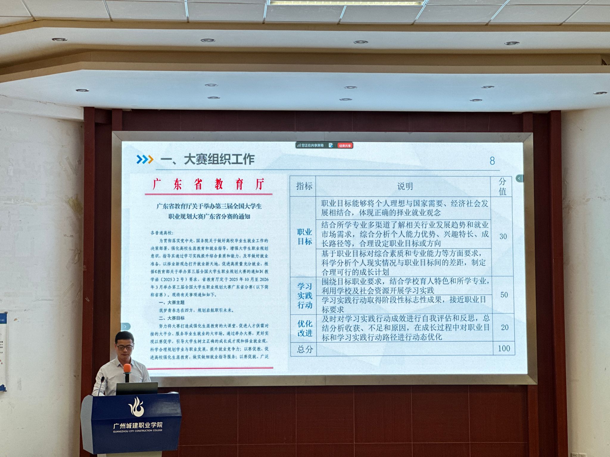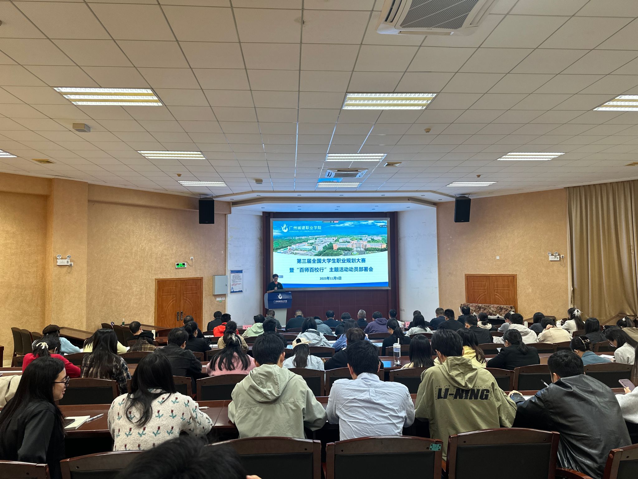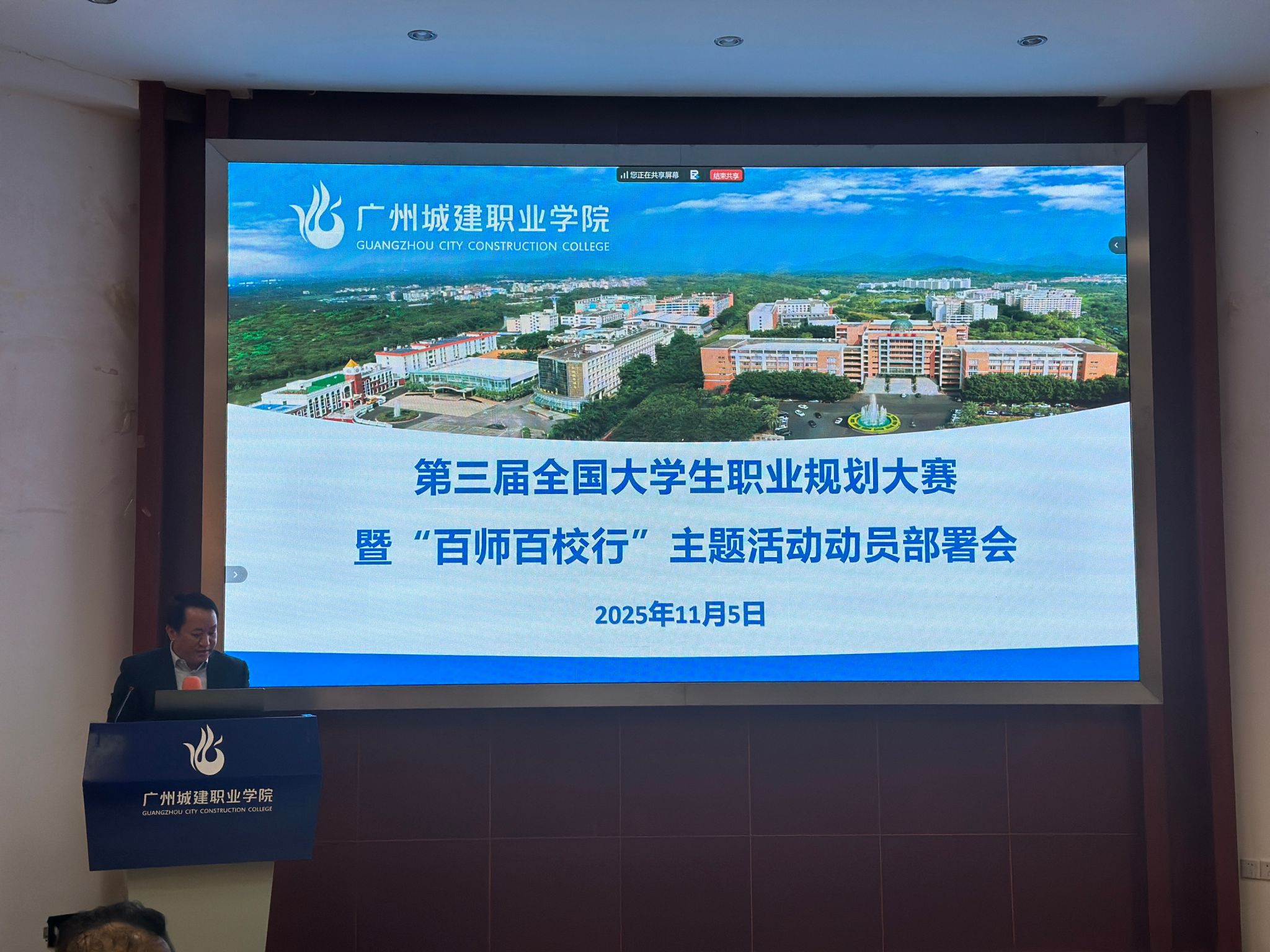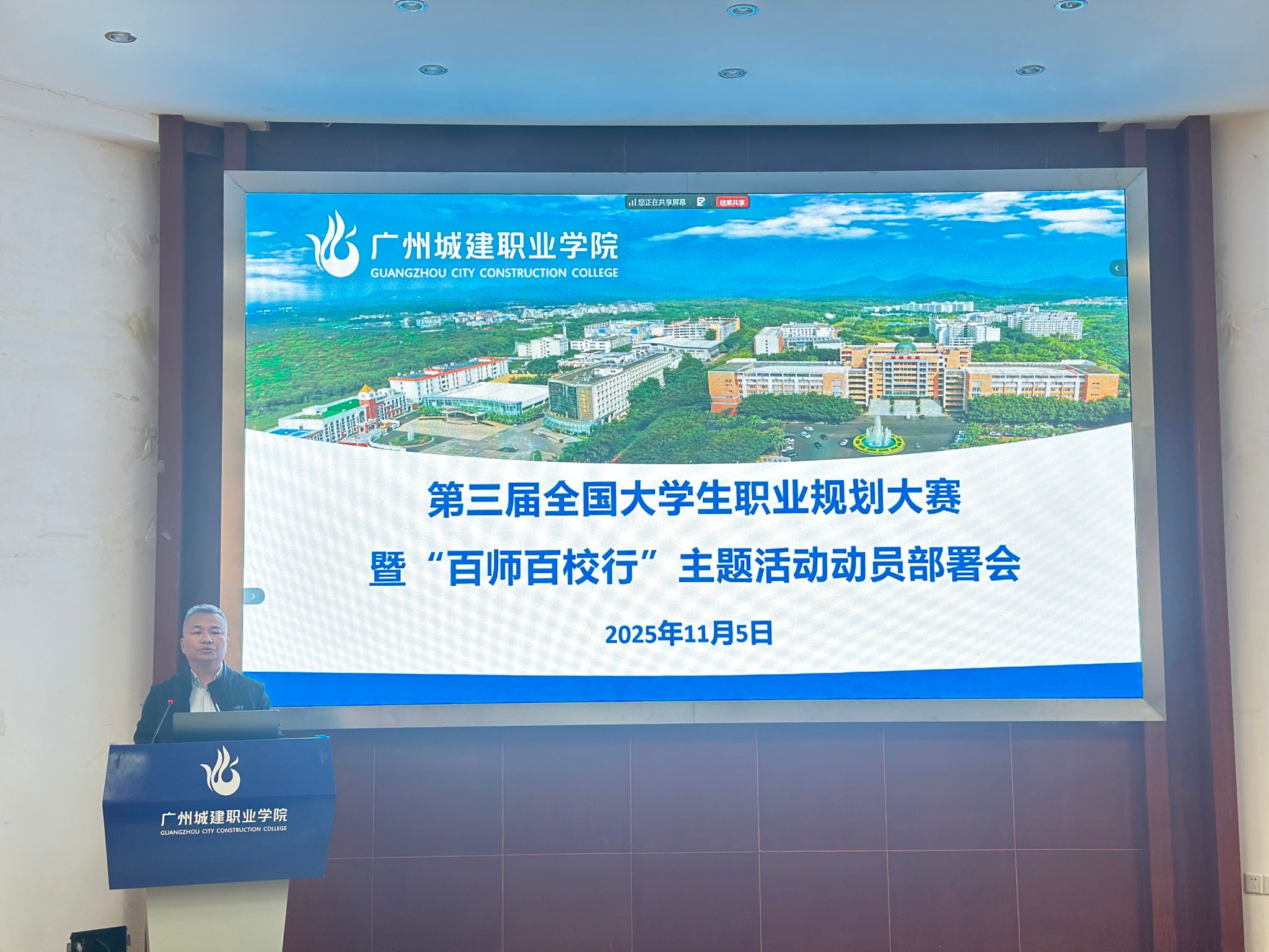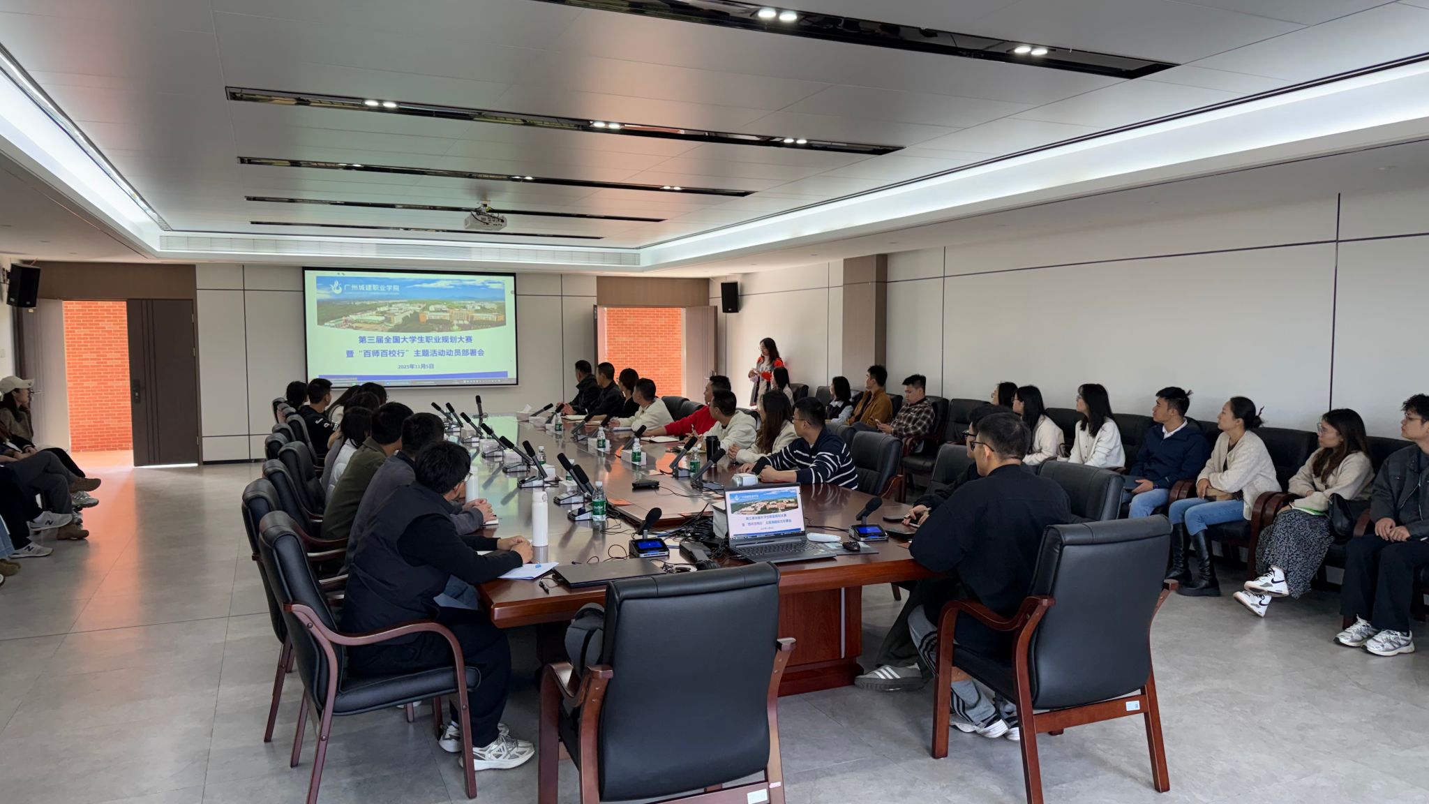 11月5日,学校在广州校区建工机电楼A101报告厅、清远校区综合楼205会议室同步召开第三届全国大学生职业规划大赛暨”百师百校行”主题活动动员部署会。学校副校长、党委副书记张德宜,校长助理、创业教育学院院长邱漠河,各二级学院学工副院长,学生就业创业处相关人员、全体辅导员及就业指导教研室全体教师参会。