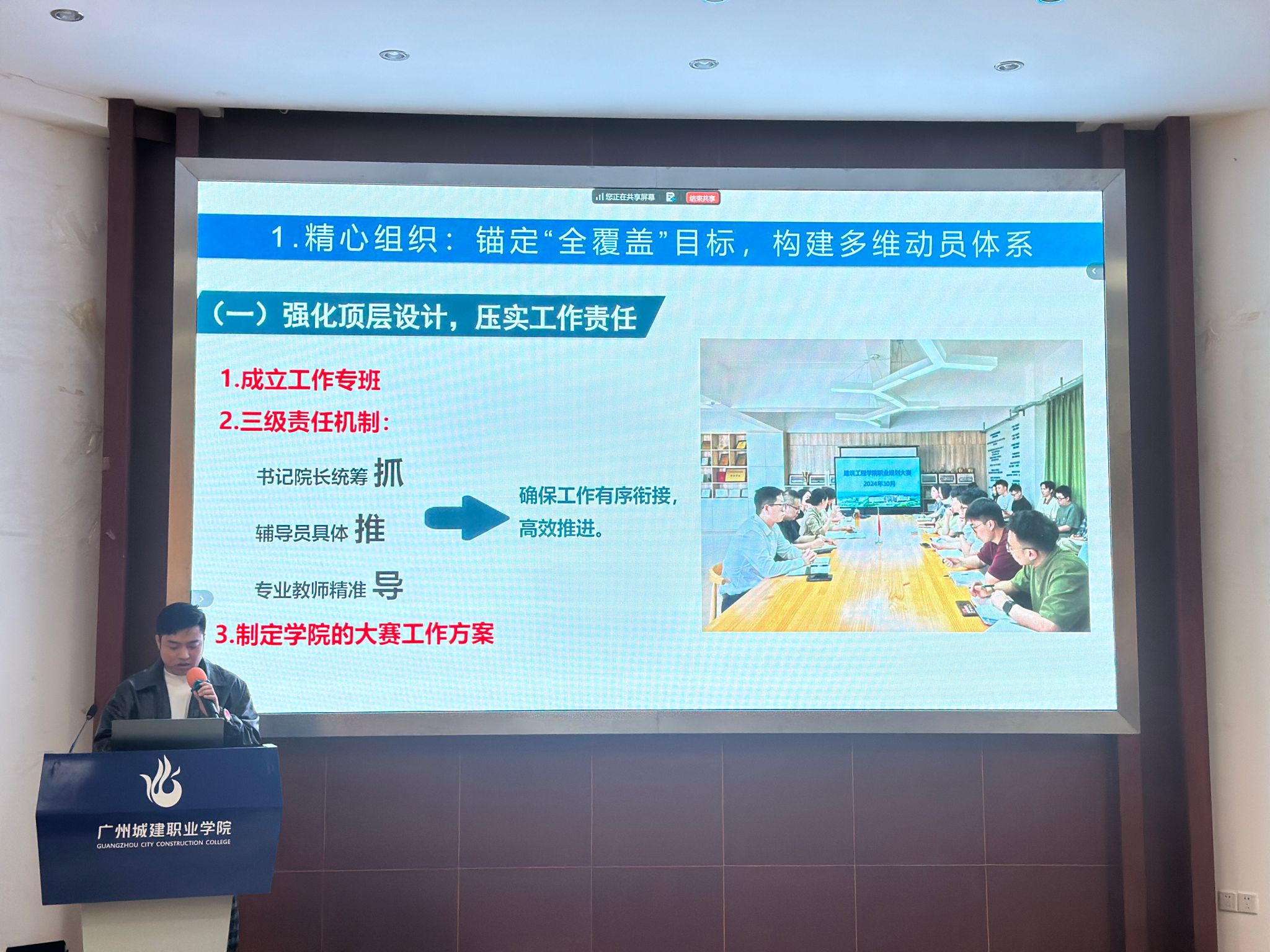 为做好大赛学生报名组织工作,建筑工程学院方晓东、医药卫生学院孙锦俊、学生就业创业处韩文杰三位老师分别作大赛报名组织工作经验分享交流和大赛报名操作系统培训。