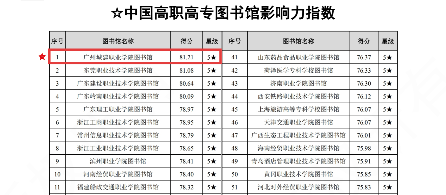 近日,《数智时代中国图书馆影响力指数报告(2025)》正式发布,我校图书馆在“中国高职高专图书馆影响力指数”排行中跃居榜首,获评五星图书馆。与2024年度相比,今年排行位次晋升了7名。