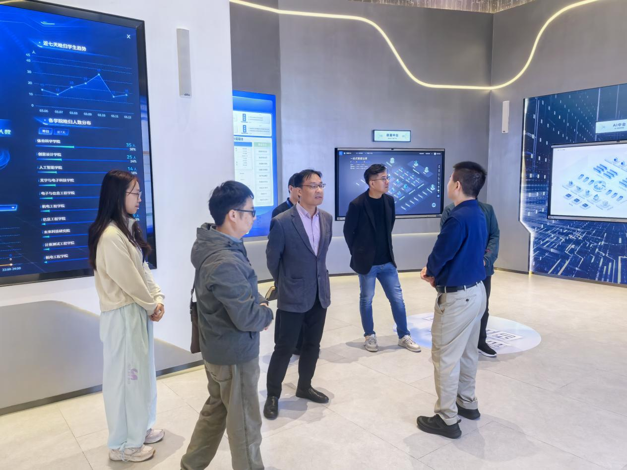调研团队受到联奕科技董事长任刚、副总载王东宏、南区经理吴东冶等领导的热情接待。在联奕科技相关负责人的陪同下,调研团队首先参观了公司的产品展示中心,详细了解了联奕科技在智慧校园、数据治理、教学信息化、物联网平台等领域的核心产品、前沿技术解决方案及创新应用成果。