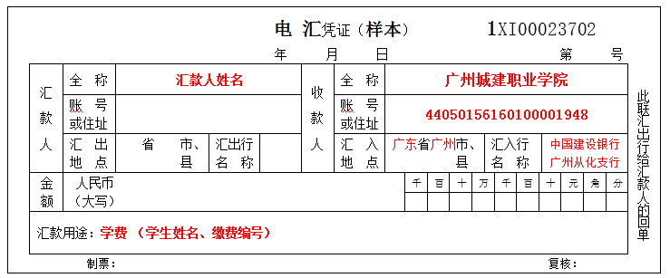 汇入行名称: 中国建设银行广州从化支行;金额栏填写缴费金额和大写金额;