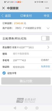 5.2.1、在订单支付页面,输入银联卡号信息(只能储蓄卡),按提示输入相关支付信息,点击“确认付款”。(注意:建议使用与银行卡预留手机号相同的手机进行缴费操作)