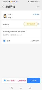 4、选择进入临时收费项目,核对缴费项目信息与金额,点击“全选”、点击“下一步”。