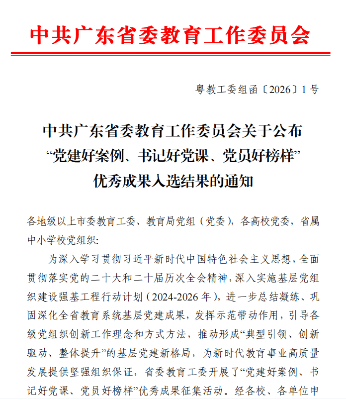 近日,中共广东省委教育工委公布“党建好案例、书记好党课、党员好榜样”优秀成果入选结果,我校数字媒体与教育学院教师党支部申报的党建工作案例《党建引领美育赋能 助推党支部品牌建设》成功入选为省级“党建好案例”。